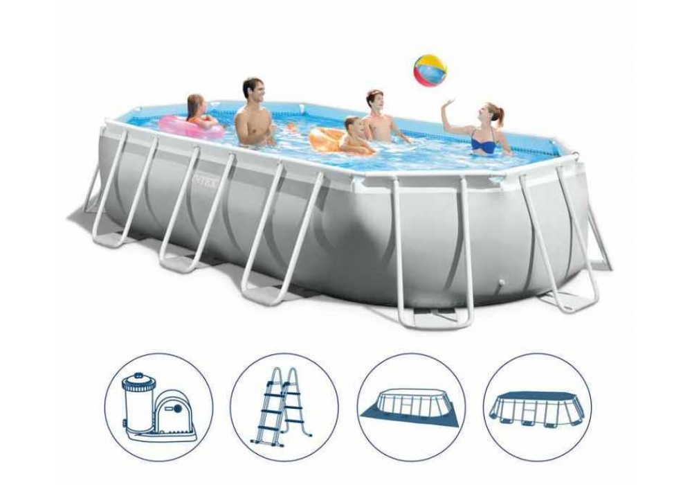 Szinterezett fémvázas medencetest, vastag és extra tartós 3 rétegű szálerősített fóliával, 5,6 m³/h teljesítményű papírszűrős vízforgatóval. Az erős PVC medence testet csőváz tartja, amelyek a testen kialakított füleken keresztül tolva merevítik a szerkezetet.
