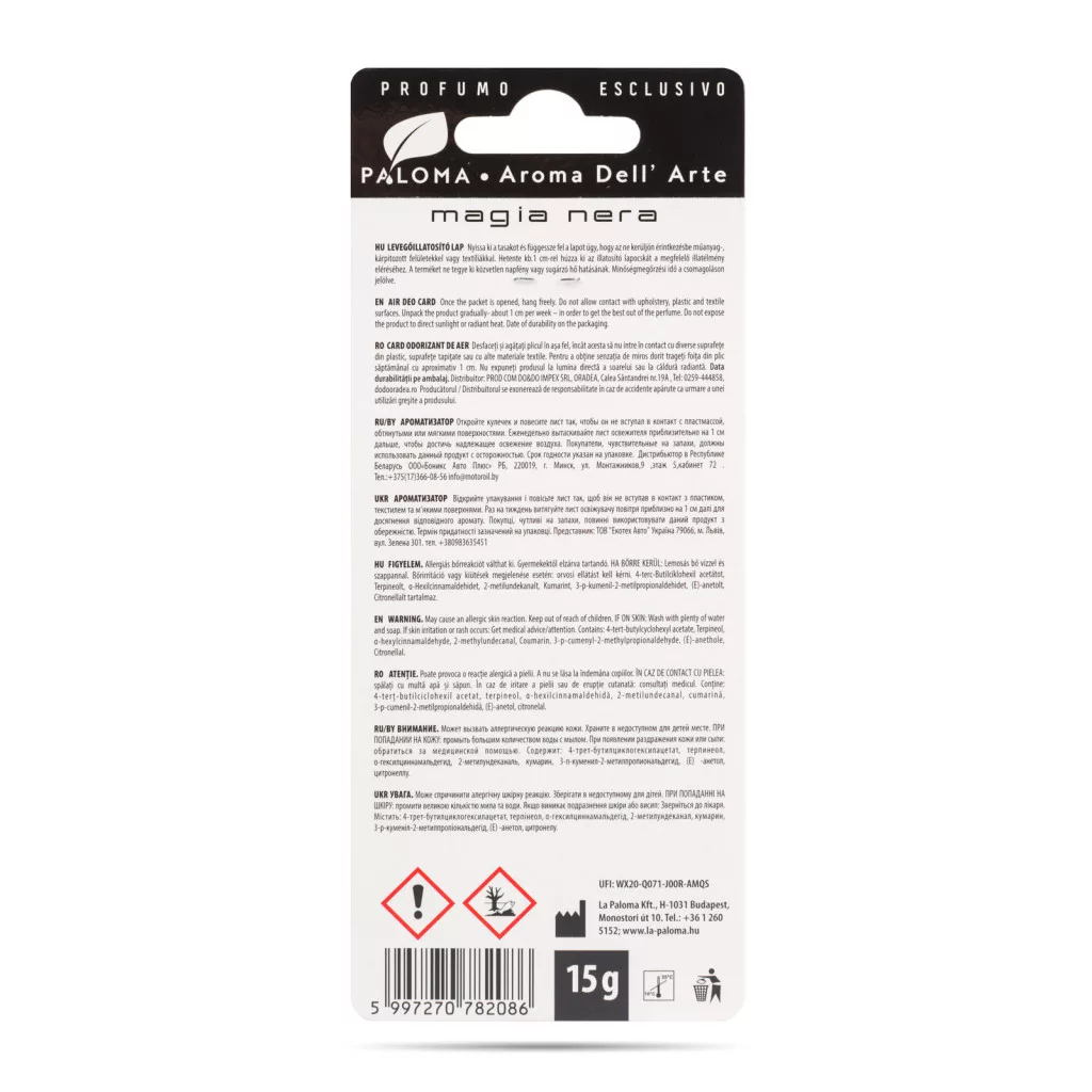A Paloma Aroma Del 'Arte illatosító család eleganciájával és kifinomultságával minden utazást különlegessé varázsol! A modern dizájn és a letisztult színvilág egyaránt kifinomult és stílusos megjelenést biztosít autójában. Az illatosító kellemes, friss illatával frissességet és tisztaságot hoz a jármű belső terébe. Ideális választás mindazok számára, akik nemcsak az illatra, hanem az autójuk belső terének harmóniájára is nagy hangsúlyt fektetnek.