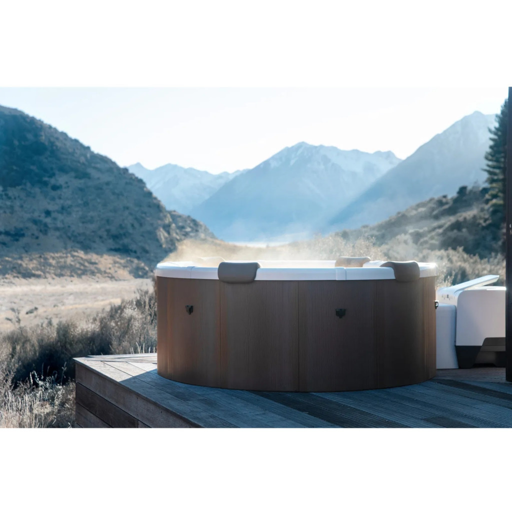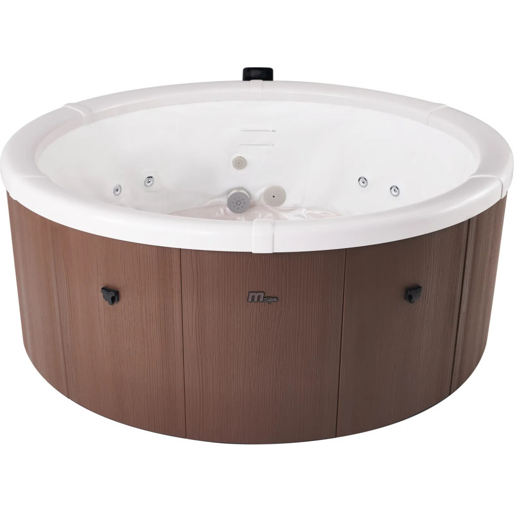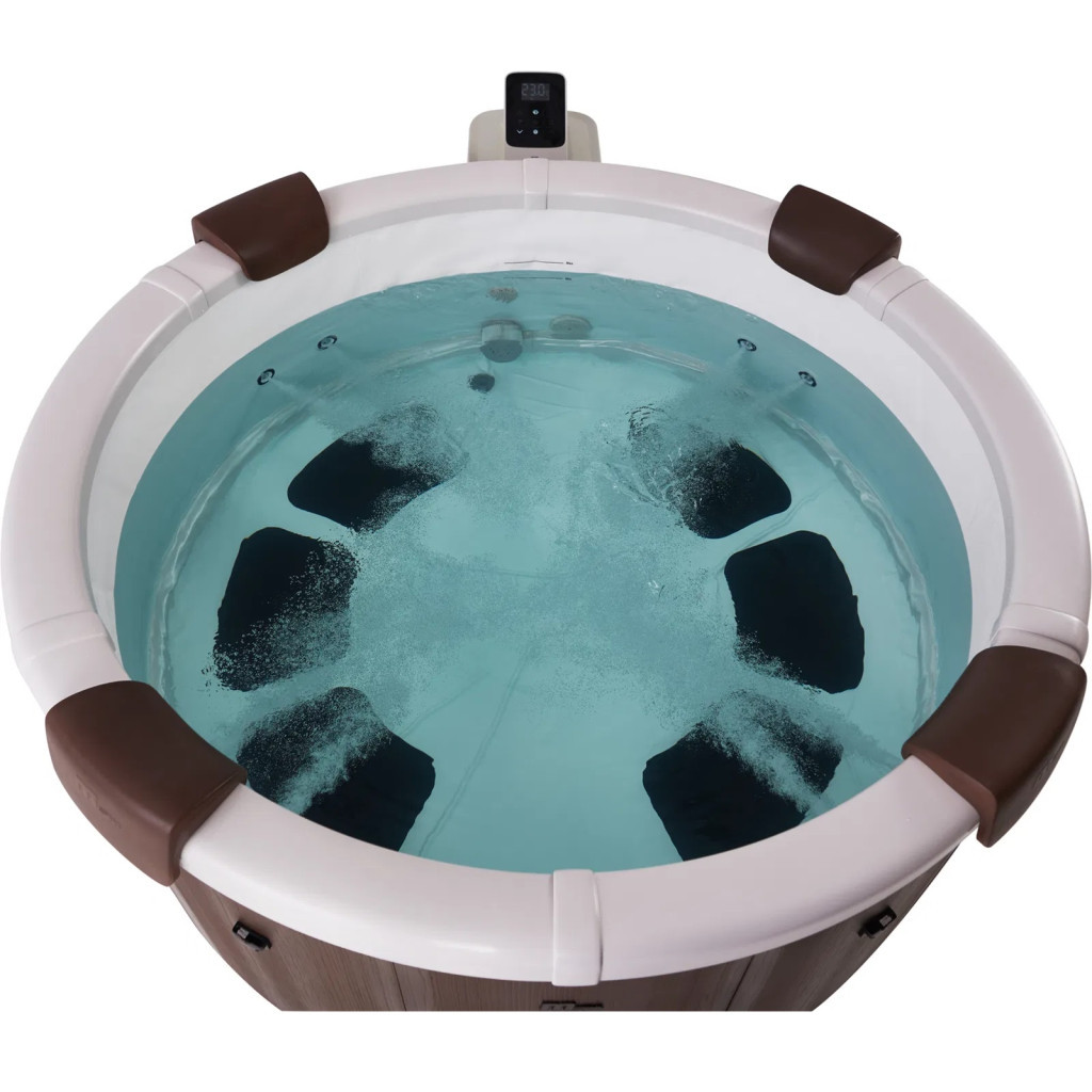 A MSpa Frame Rome pezsgőfürdő exkluzív wellness-élményt varázsol otthonodba. A 182 cm átmérőjű, 70 cm magas kád akár hat felnőtt számára is bőséges teret nyújt, miközben közel 790 liter vízben élvezhetitek a pezsdítő hullámokat. A tartós Rhino-Tech™ erősített PVC külső és az AcrySkin™ belső héj ellenáll az időjárásnak, a faerezetes panelek pedig elegáns, prémium megjelenést biztosítanak.