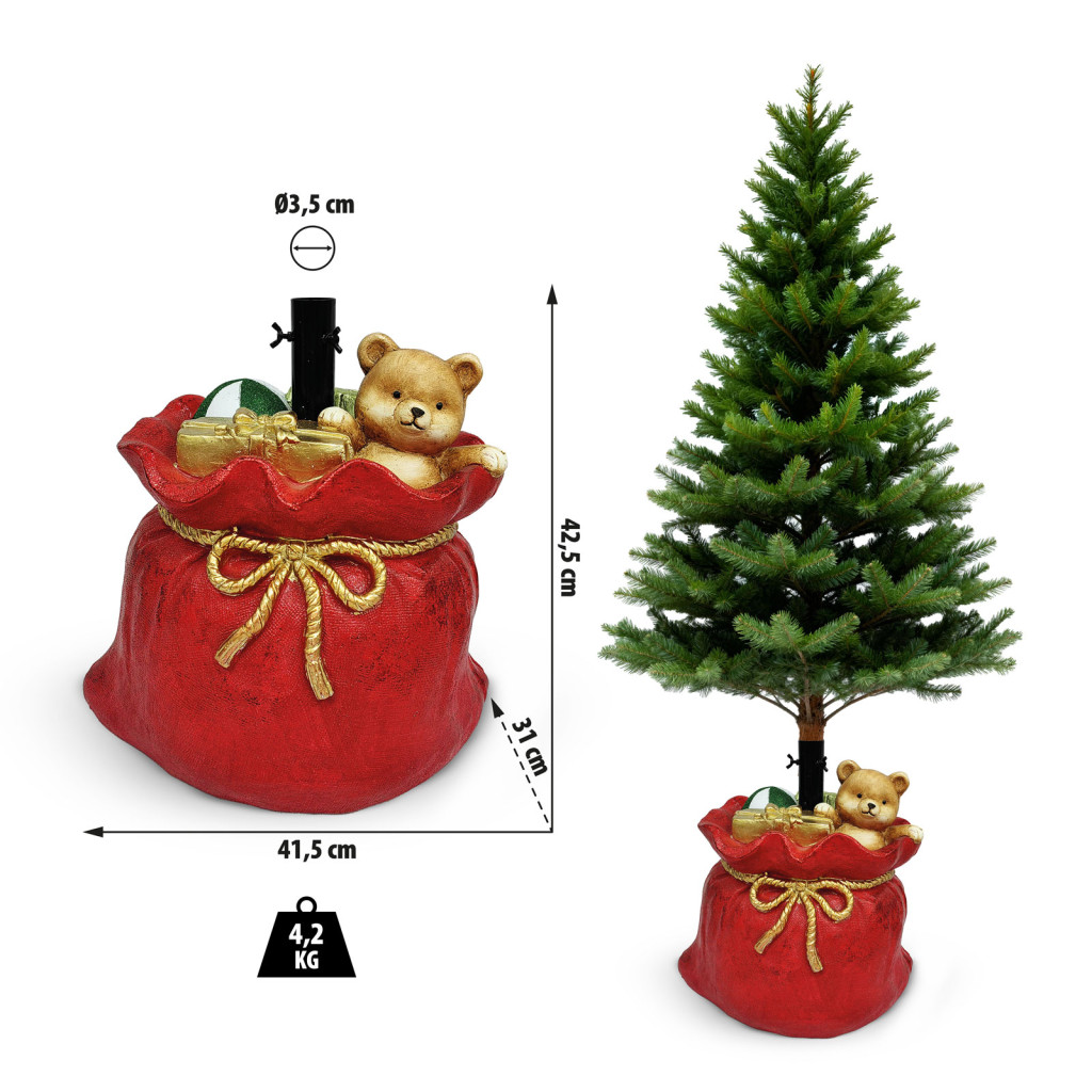 Ez az mikulászsák formájú karácsonyfa talp nemcsak praktikus, de dekoratív eleme is lehet a karácsonyfának. A piros színű, arany madzaggal díszített zsák élethű ajándékkal teli mikuásputtony benyomását kelti, miközben stabilan tartja a karácsonyfát. A műkőből készült talp erős tartást biztosít nagyobb méretű fák esetén is.