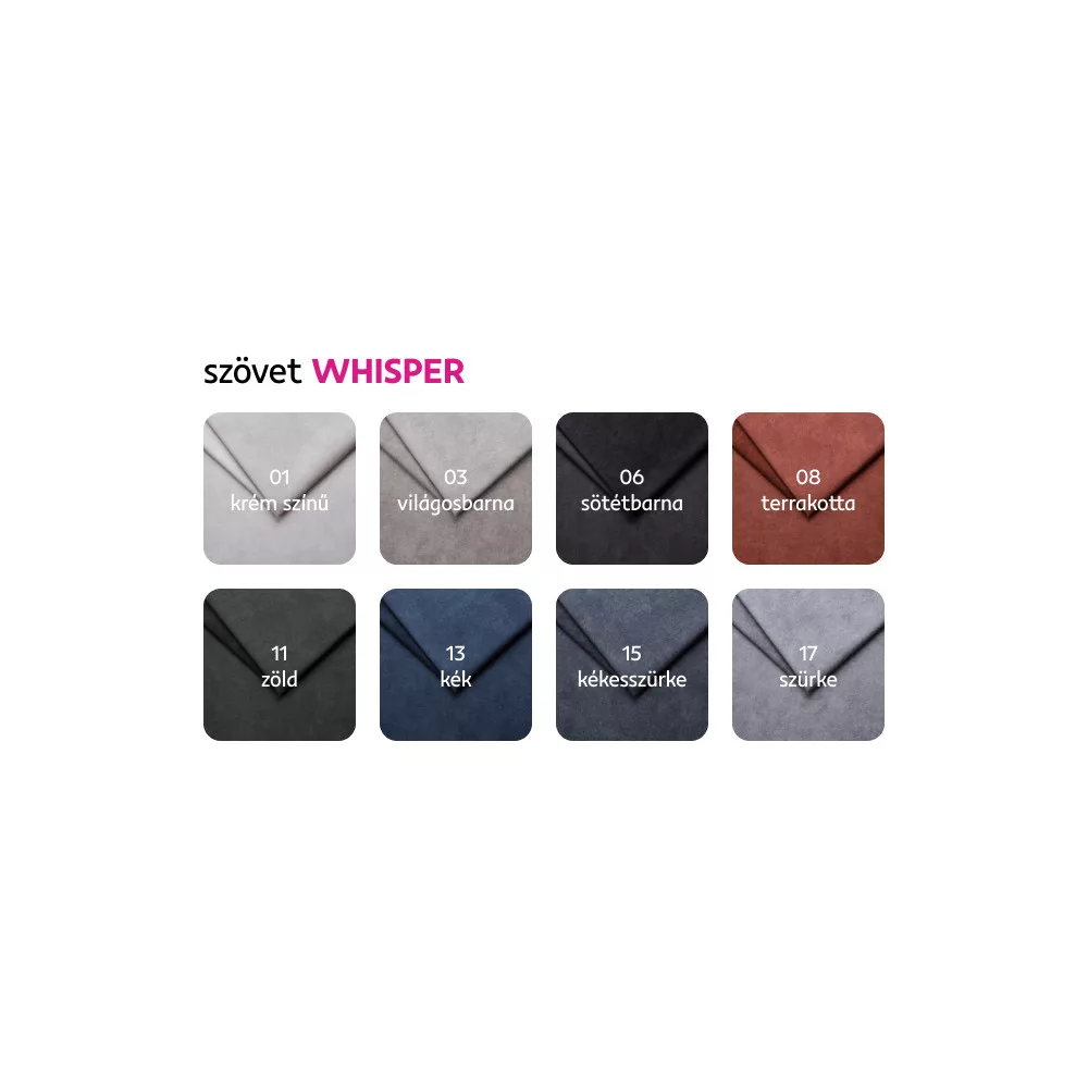 A Whisper szövet 8 színváltozatában megrendelhető, 6-8 hét szállítási idővel, ár: 666 900 Ft. Egyedi megrendelés esetén a megadott összeg 20%-át előlegként szükséges befizetni. Az előleg befizetése után kérése a gyártásba kerül.