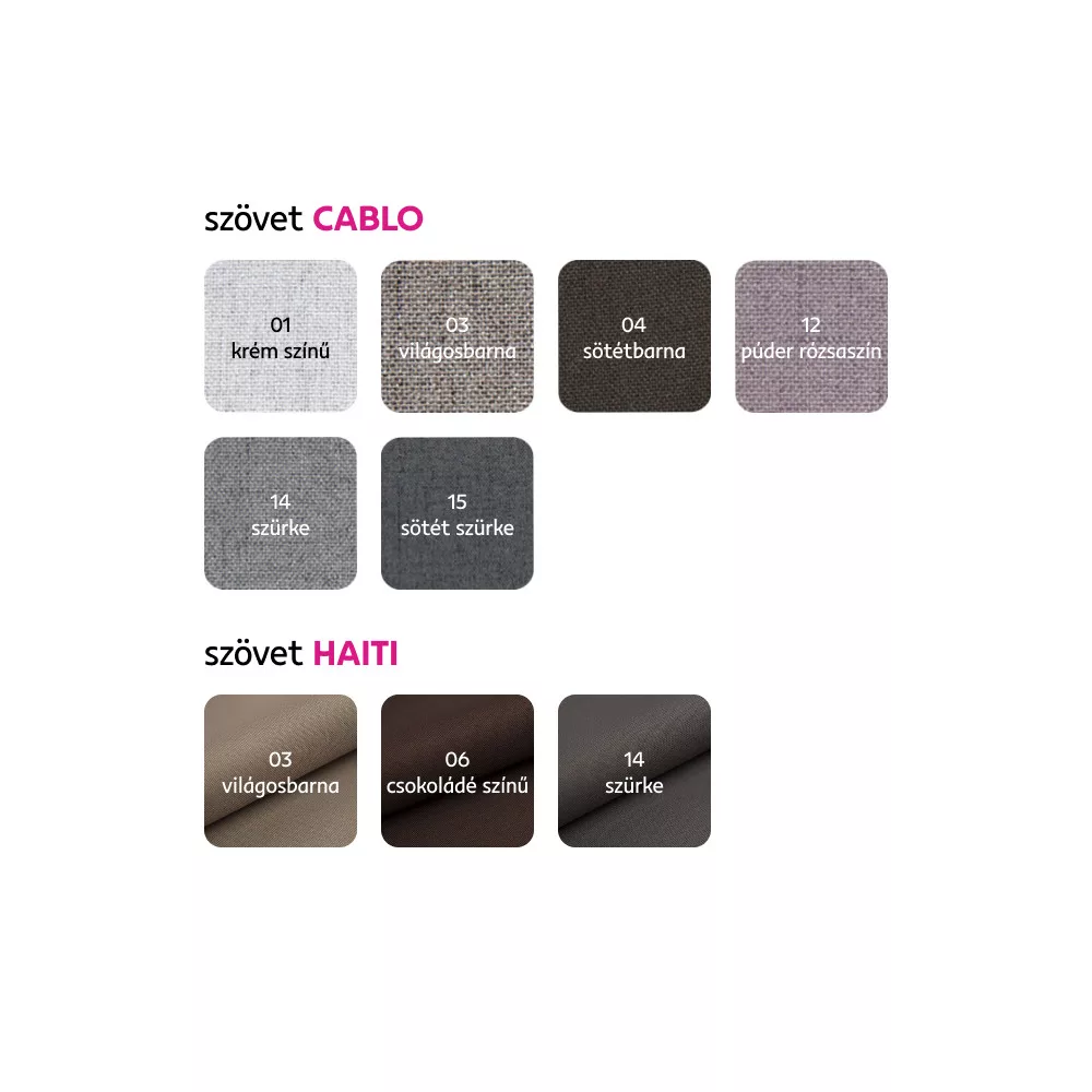 Rendelhető 3 színváltozatban Haiti szövetből vagy a 6 színváltozatban Cablo szövetből ár: 188 500 Ft. Egyedi megrendelés esetén szükség van az adott összegnek a 20%-át befizetni,mint előleg. Az előleg befizetése után az Ön követelményét benyújtjuk a gyártónak. Szállítási idő: 6-8 hét.