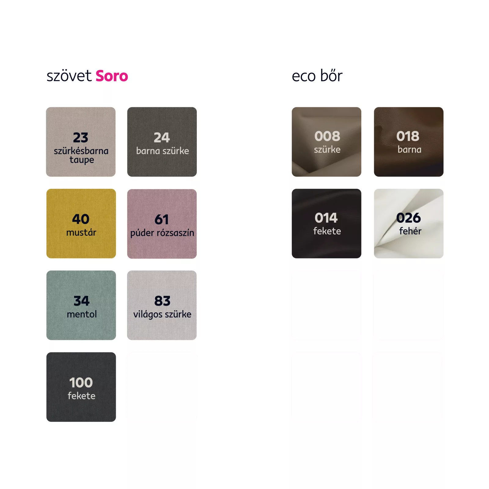 Megrendelhető az ekobőr 4 színváltozatában és a Soro szövet 7 színváltozatában ár 575 900 Ft. Kérjük, hogy a választott színt írja be megrendeléskor a megjegyzés részbe. Egyedi megrendelés esetén a megadott összeg 20%-át előlegként szükséges kifizetni. Az előleg befizetése után a megrendelése gyártásba kerül. A szállítási idő 6-8 hét.