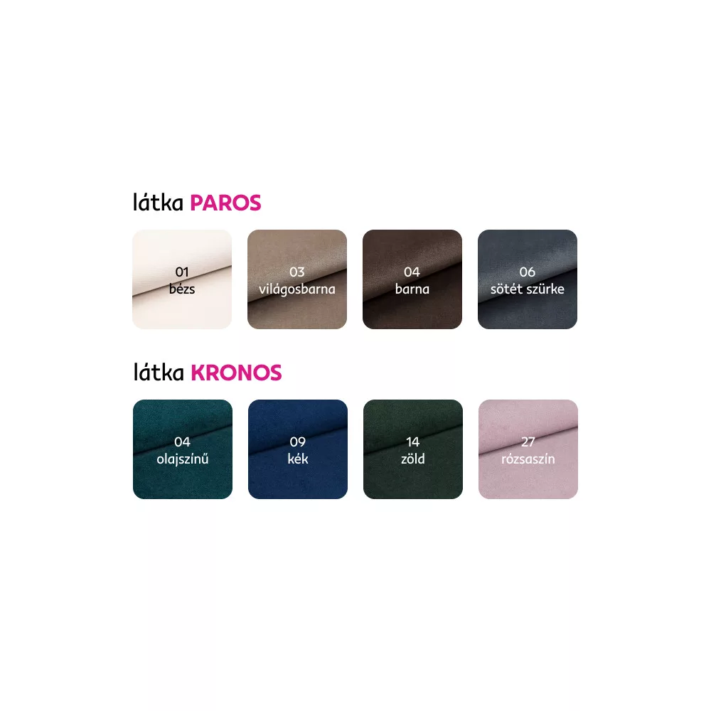 Megrendelhető a Paros szövet 4 színárnyalatában és a Kronos szövet 4 színárnyalatban 6-8 hét szállítási idővel. Egyedi megrendelés esetén az összeg 20%-át előlegként szükséges befizetni. Az előleg befizetése után a megrendelése gyártásba kerül.
