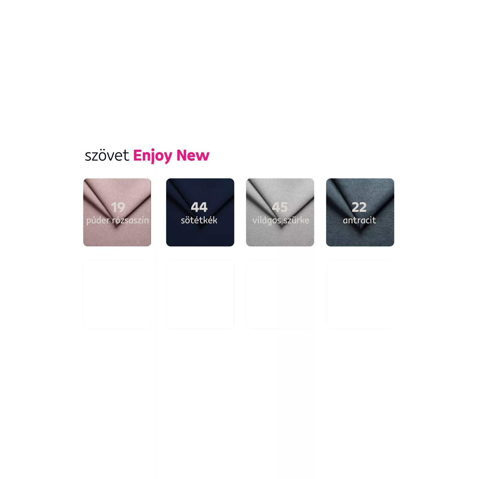 Megrendelhető az Enjoy szövet 4 színváltozatában 6-8 hét szállítási idővel. Egyedi megrendelés esetén az összeg 20%-át előlegként szükséges befizetni. Az előleg befizetése után a megrendelése gyártásba kerül.