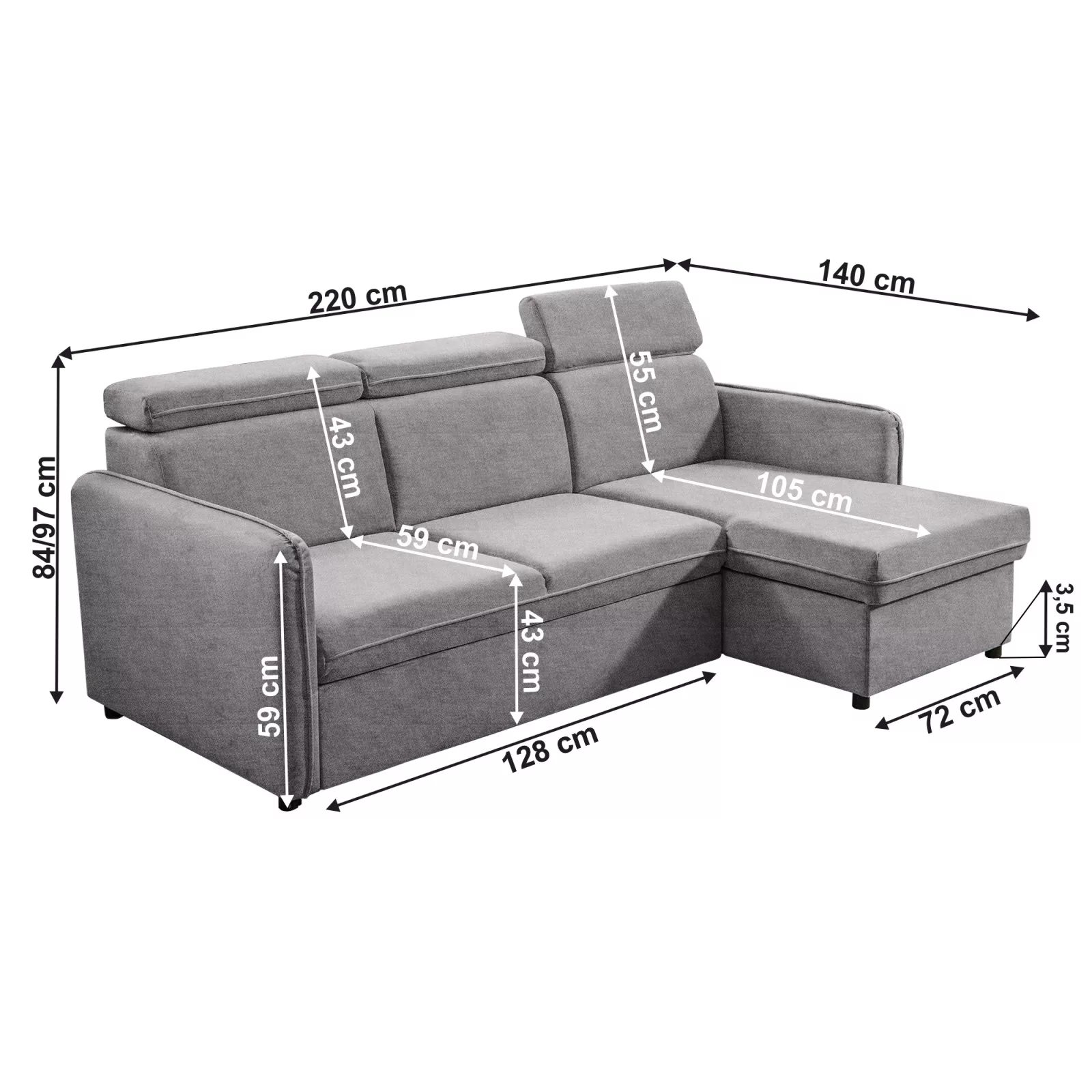 Méretek (SzxMéxMa): 220x140x84/97 cm
