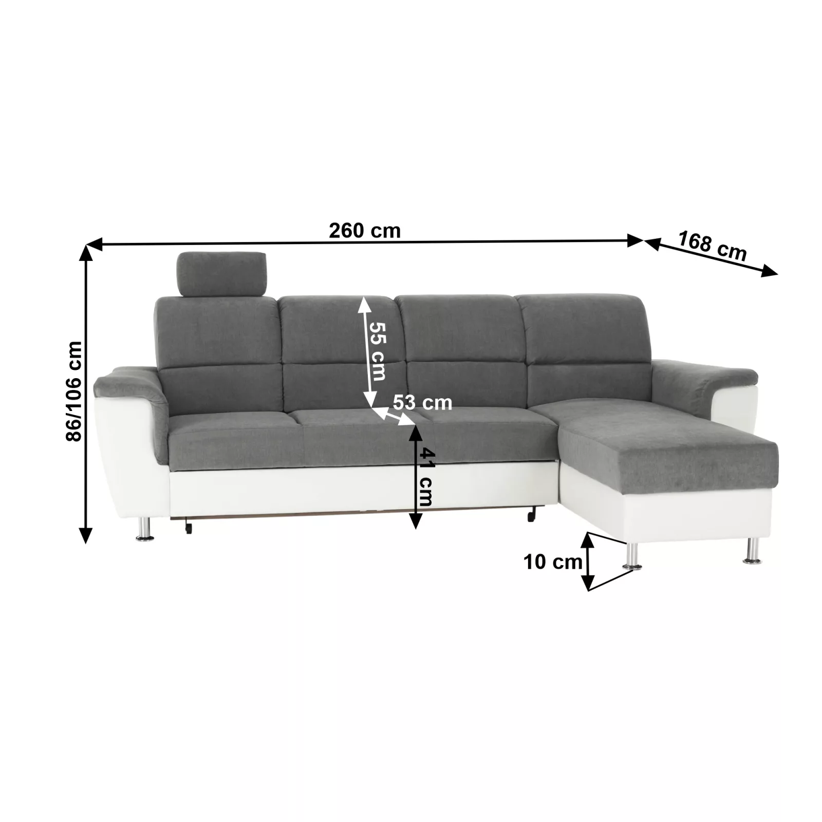 Méretek: (SzéxMéxMa): 260x168x86/106 cm
