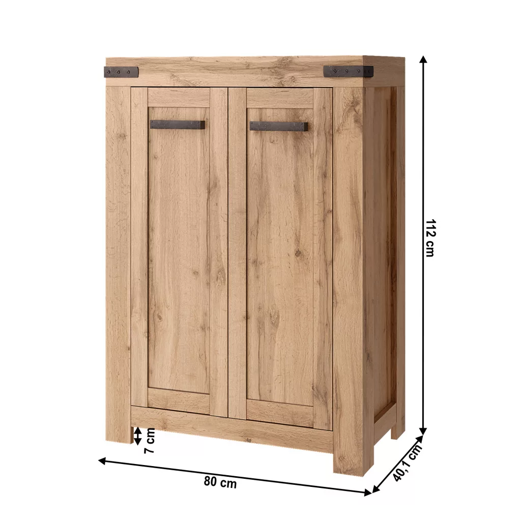 Komód MORATIZ 2D/80 Anyag: laminált DTD/MDF/műanyag Szín: wotan tölgy Méretek (SzxMéxMa): 80x40,1x112 cm Lábak magassága 7 cm Anyag vastagsága: 1,6 - 2,2 cm Kétajtós Egy szekrény A szekrényben polcok találhatók Műanyag dekoráció és fogantyúk MDF ajtók Szétszerelt állapotban szállítva