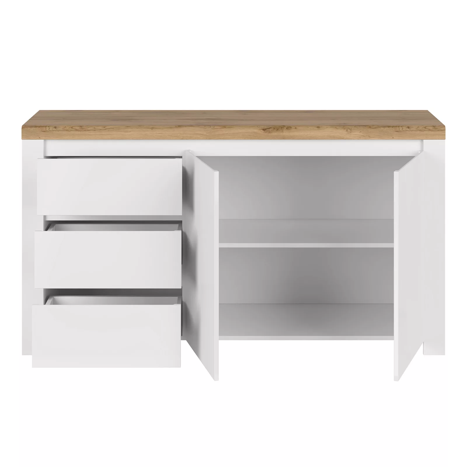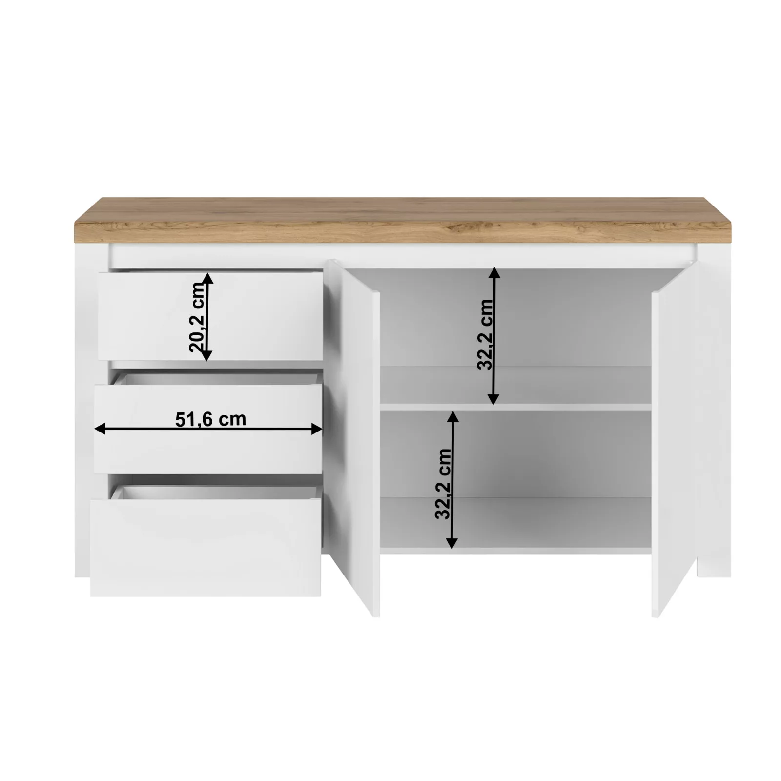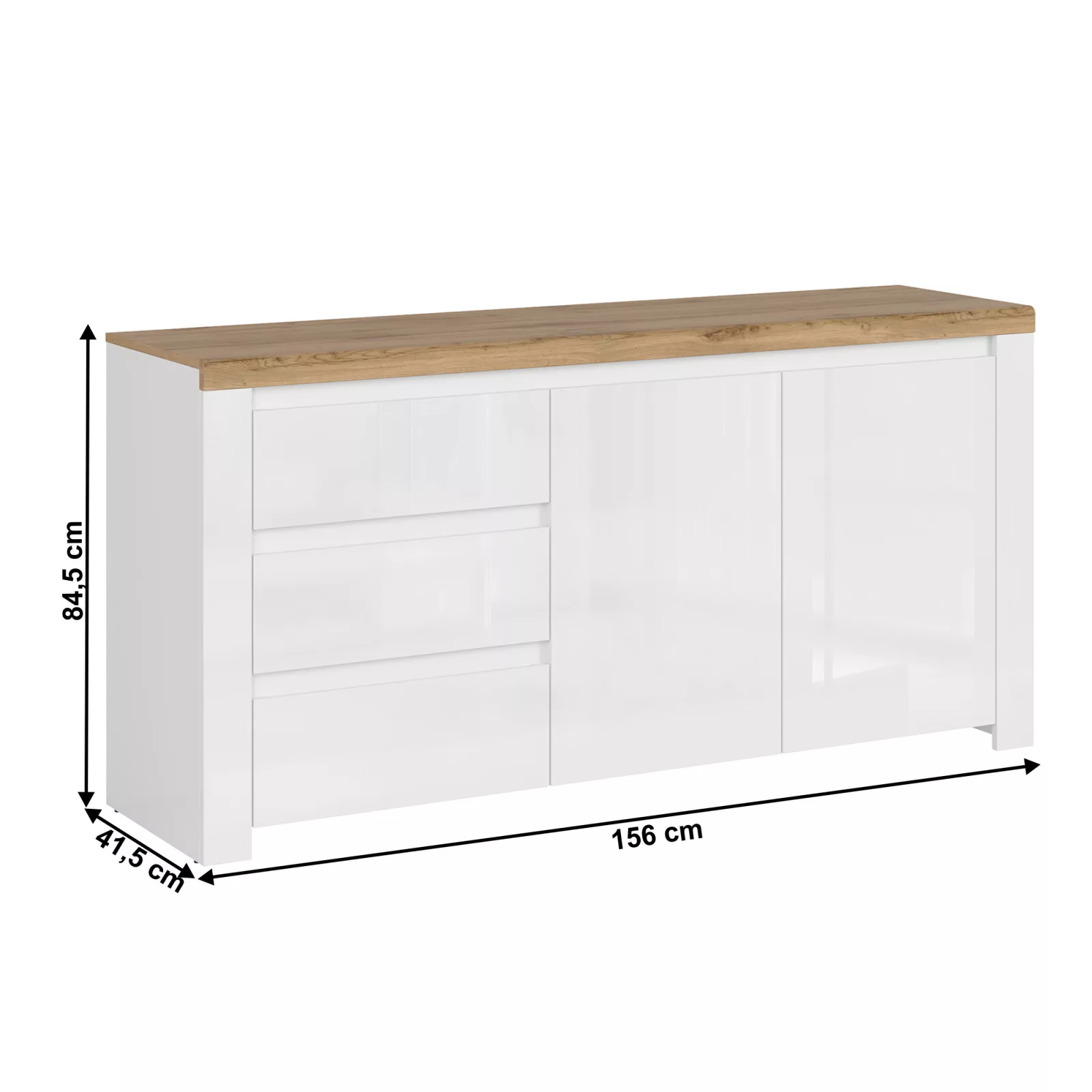 Anyag: laminált DTD/ABS élek/MDF Szín: fehér extra magasfényű/wotan tölgy Méretek(SzxMéxMa): 156x41,5x84,5 cm Az alsó tér magassága a padlótól: 5 cm Anyag vastagsága: 1,6 - 2,2 cm Három polc Fiókok mérete (SzxMa): 51,6x20,2 cm Egy szekrény A szekrényben polcok vannak Polcok magassága: 32,2 cm MDF ajtók Nyitás/zárás a kivágással Bontásban szállítva