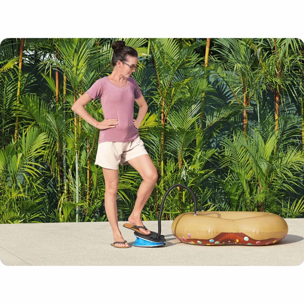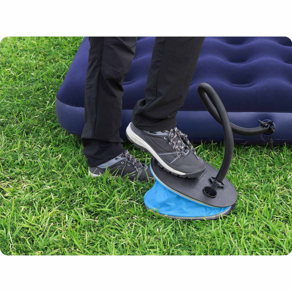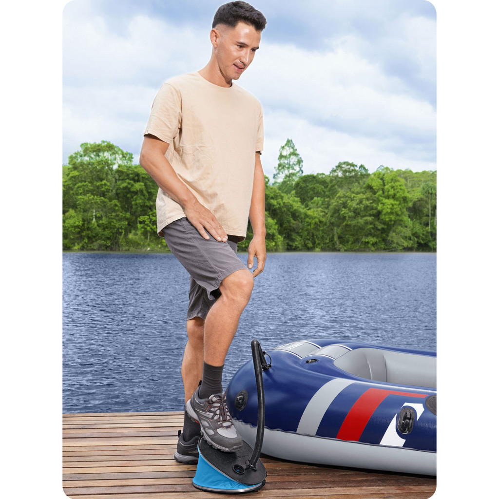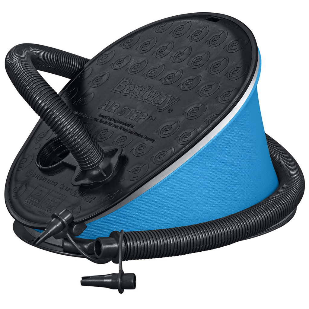 A Bestway 62005 lábpumpa 1,6 literes lökettérfogattal pillanatok alatt életet lehel minden felfújható termékbe. Az ovális, stabil talpfelületre ráállva egyetlen lendületes lépéssel akár 1,6 liter levegőt juttathatsz a matracba, úszógumiba vagy gyermekjátékba. A kék-fekete, strapabíró műanyag ház és a bordázott, csúszásmentes felület hosszú távon is megbízható társad lesz otthon, nyaraláson vagy kempingezéskor.