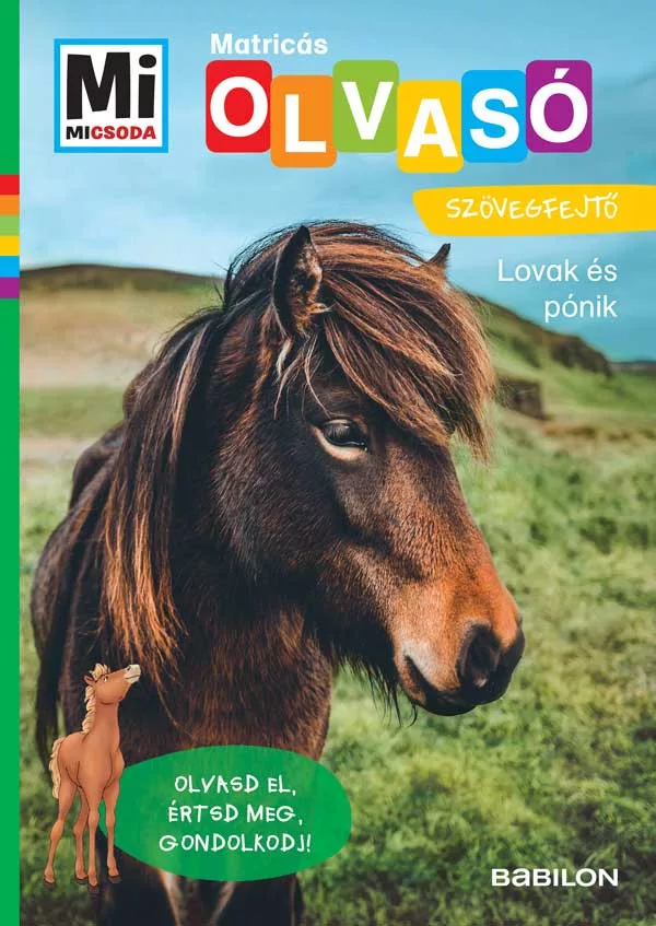 A Mi MICSODA Olvasó Lovak és pónik kötetét kiegészítő vagy önállóan is használható foglalkoztató. Felhő, a csikó vezeti az olvasókat. Az oldalpárba rendezett, rövid ismeretterjesztő szövegeket változatos rejtvények és a szövegértést segítő feladatok követik.