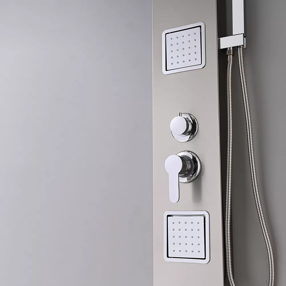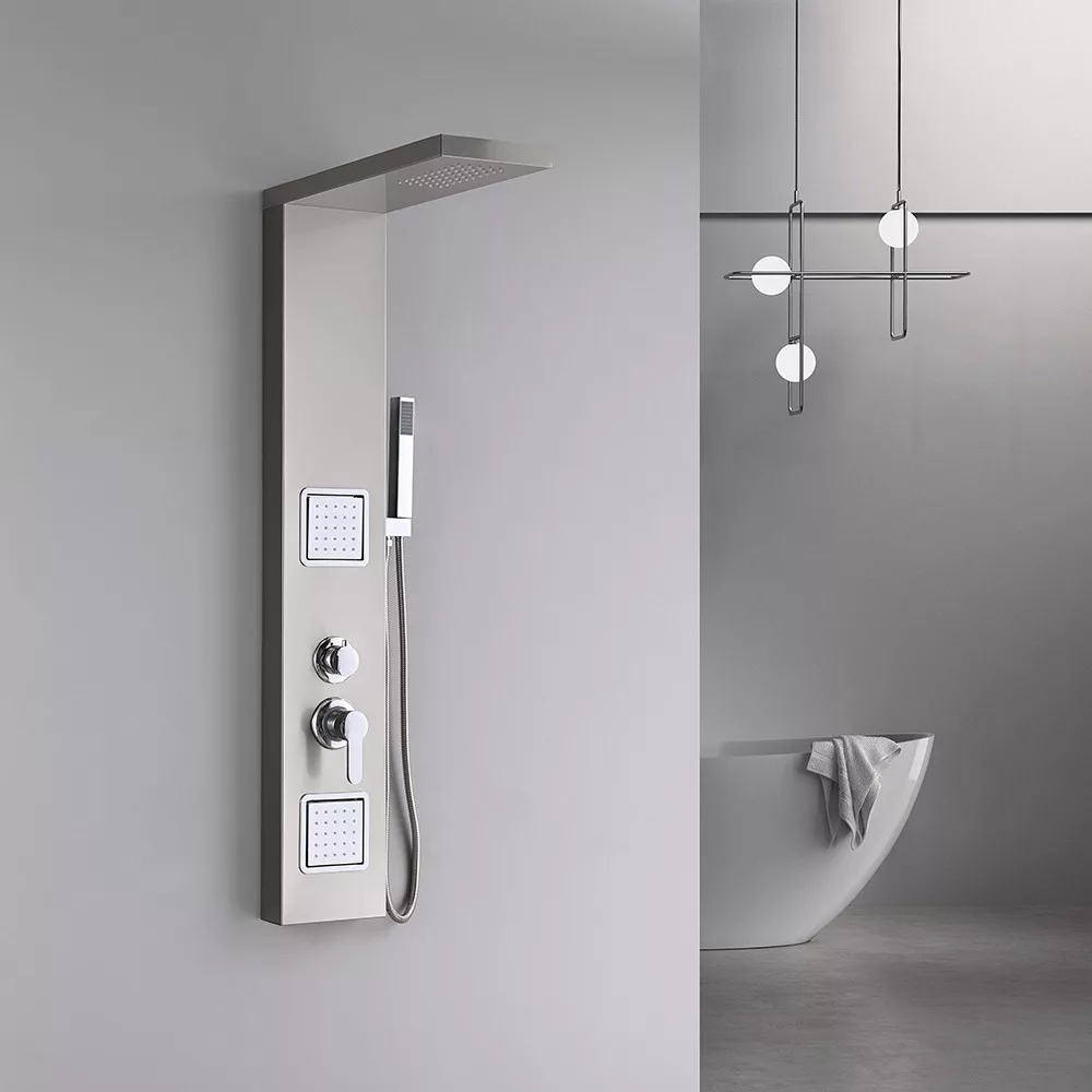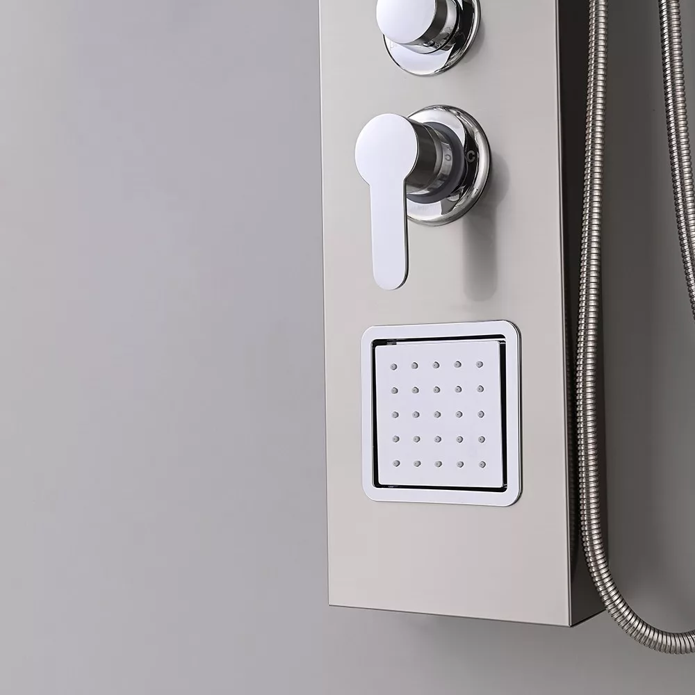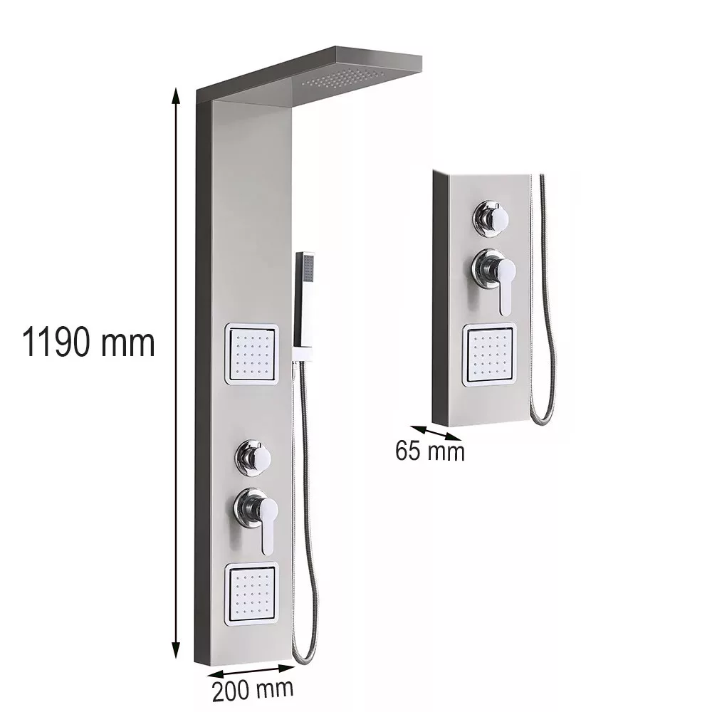 A Merino hidromasszázs zuhanypanel egy kiváló minőségű, modern és stílusos zuhanypanelegyüttes, amelyet az élménydús fürdőzés és zuhanyozás szerelmeseinek terveztek. A panel mérete 119x19x6,5 cm, ami ideális méretet biztosít a fürdőszobák számára, akár a nagyobb, akár a kisebb terekhez. Ez a zuhanypanel 0,8 mm vastagságú szálcsiszolt rozsdamentes acélból készült, ami nemcsak kiemelkedően tartós, de elegáns megjelenést is kölcsönöz a fürdőszobának. A szálcsiszolt felület finom és esztétikus, tovább fokozva a zuhanypanel vonzó megjelenését. A rozsdamentes acél anyagból készült zuhanypanel ellenáll a rozsda, a vízkő és a korroziónak, így hosszú élettartammal rendelkezik, és könnyen tisztán tartható.