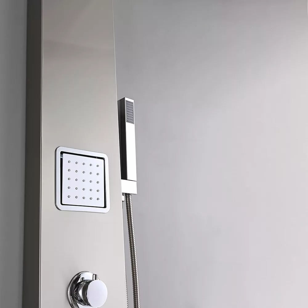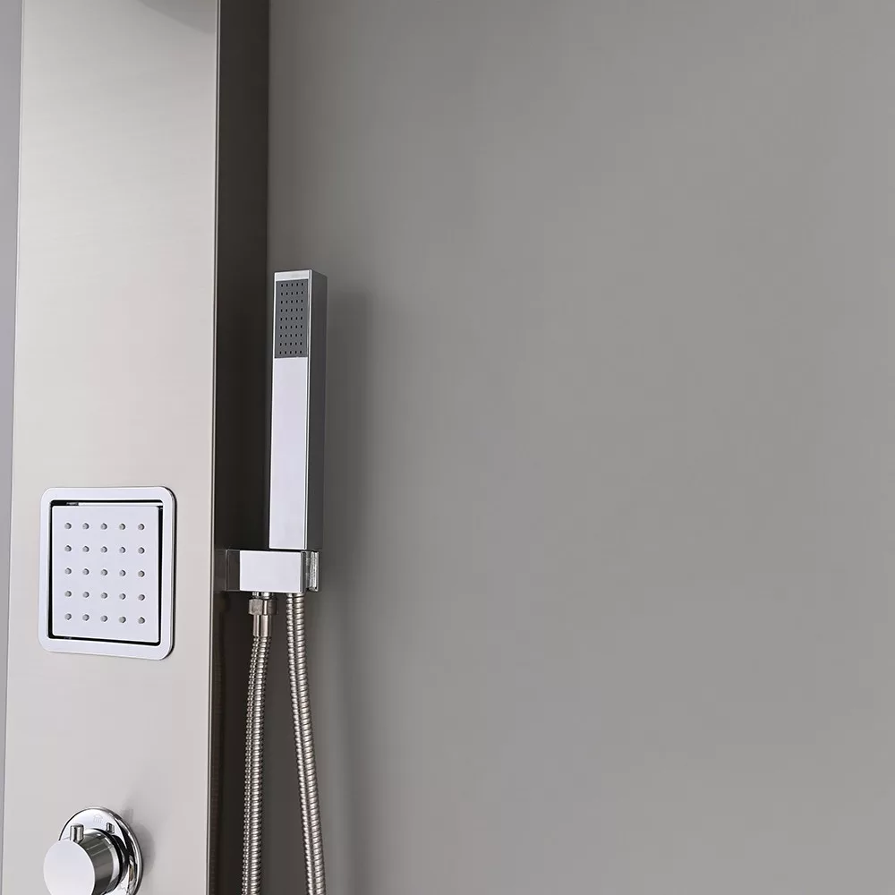 A zuhanypanel további funkciói közé tartozik egy vízesés, amely egy másik különleges élményt nyújt. A vízesésnek köszönhetően a víz folyik lefelé az ember hátára, kellemes masszázsszerű hatást nyújtva, és feloldva az izmok feszültségét. A vízesés funkcióval kombinálva hátsó fúvókák találhatók a zuhanypanelen, amelyek különösen jótékony hatással vannak a hátmasszázsra. A zuhanypanel további kényelmi funkcióval rendelkezik egy kézi zuhannyal is, amely lehetővé teszi a célzottabb vízirányítást és a zuhanyozás személyre szabását. A kézi zuhany praktikus, ha nem szeretnénk beállni az esőztető vagy a vízesés alá, vagy ha csak a hajmosáshoz vagy a test adott részének tisztításához van szükségünk a zuhanyozás közben.