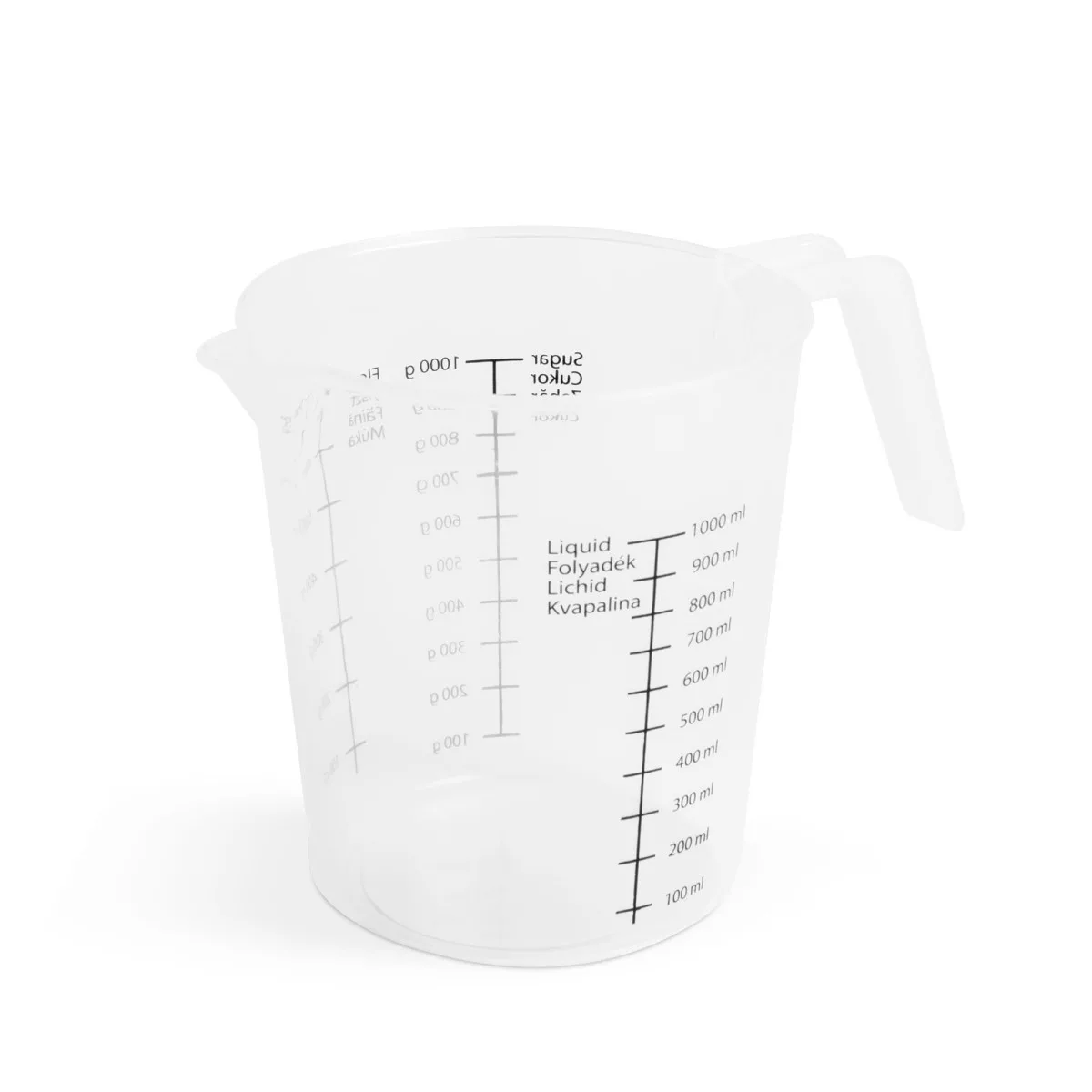 A könnyű használat érdekében kiöntő csőrrel és füllel van ellátva. Skálázott, folyadékot 1 literig, cukrot 1000 grammig, lisztet 700 grammig mérhetünk.