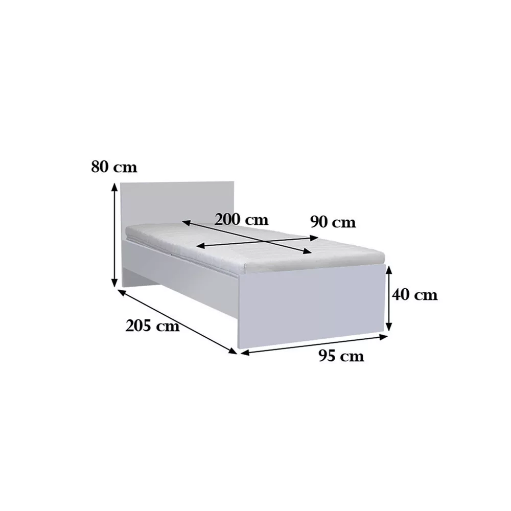 | Méretek | Ágykeret: 205 x 95 cm, Ágytámla: 80 x 95 cm, Matrac (ajánlott méret): 200 x 90 cm. |