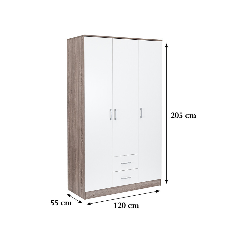 Az elegáns fehér front és a fahatású yorki tölgy korpusz ötvözete tökéletes harmóniát teremt a nappaliba vagy a hálószobába egyaránt. A 205 cm magas, 120 cm széles és 55 cm mély gardróbszekrény ideális választás mindenki számára, aki szeretné rendszerezni ruháit és kiegészítőit.