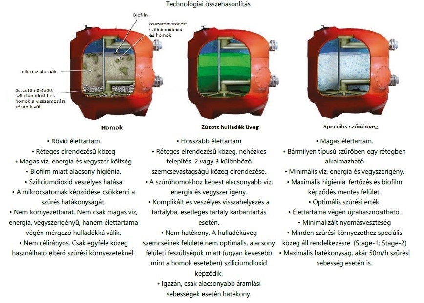 A szűrőüveg aszeptikus tulajdonságainak és az Anti-Compaction Technology® technológiának köszönhetően megakadályozza a biofilm kialakulását, így hosszabb élettartamot és folyamatosan magas szűrési teljesítményt biztosít. A gyártói anyag szerint akár 99,64%-os szűrési hatékonyság is elérhető, miközben csökkenti az energia-, víz- és vegyszerfelhasználást.