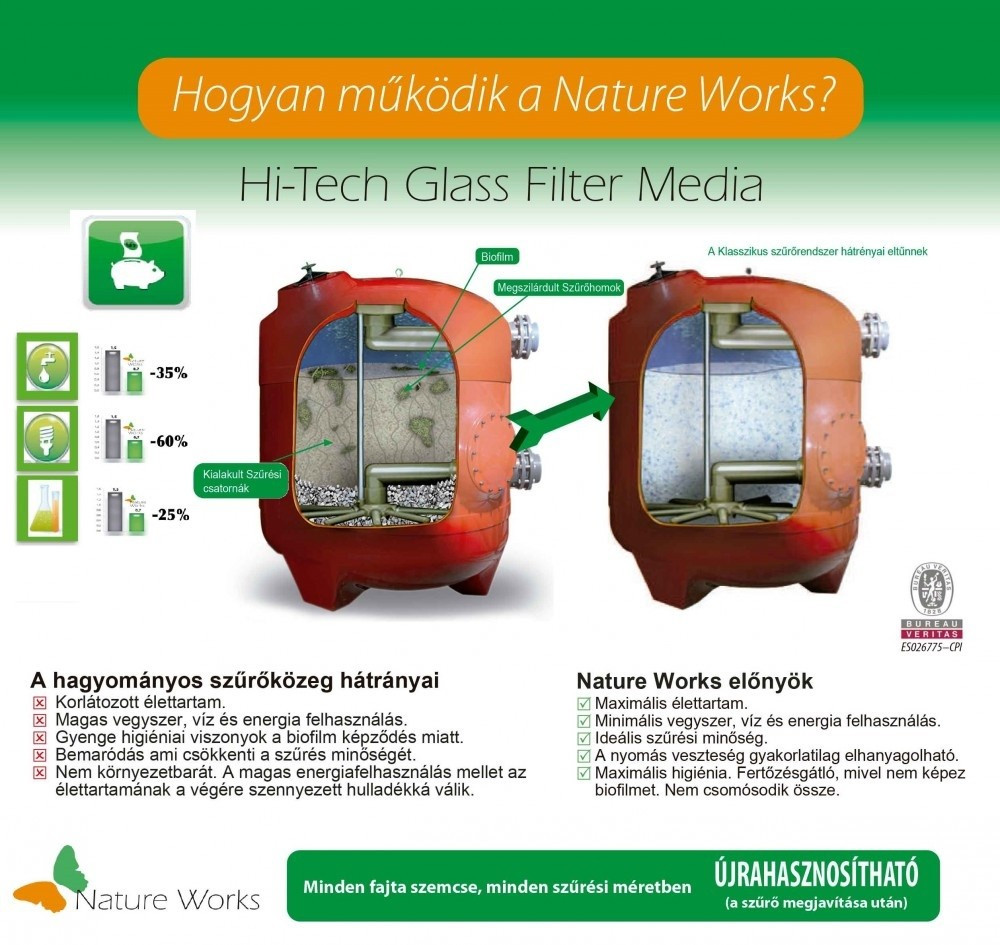 A Nature Works szűrőüveg egy innovatív, új generációs szűrőtöltet, amely kiváló vízminőséget biztosít medencék és ipari vízszűrő rendszerek esetén. A speciális gyártási technológiának köszönhetően hatékonyabb és higiénikusabb megoldást kínál a hagyományos szűrőhomokkal szemben.