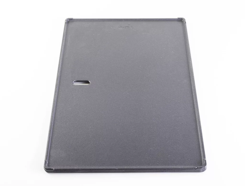 Az öntöttvas az egyik legtartósabb anyag grillezéshez. Ellenáll a magashőmérsékletnek és a karcolásoknak is. Ez az öntöttvas lemez két részrevan osztva. Az egyik fele sima, melyet főleg a szeletelt zöldségek,tojások és sajtok grillezésére használják. A másik fele bordázott, ezta steak, nagyobb zöldségek és halak szerelmesei fogják leginkábbértékelni.