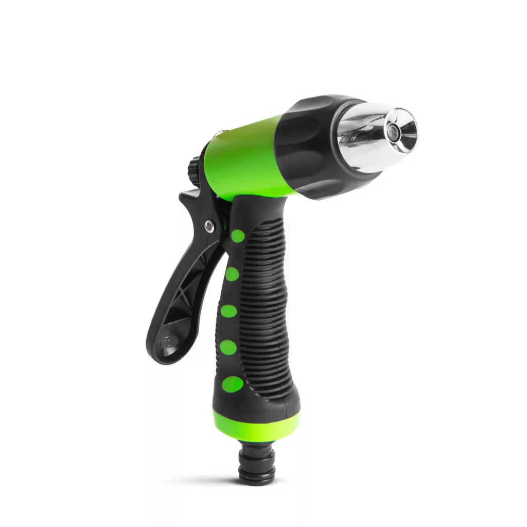 Kiváló minőségű műanyag locsoló pisztoly, amely 3 féle vízsugárral rendelkezik, így garantáltan megtalálja az Önnek szükséges vízsugarat, legyen szó porlasztásról vagy vékony vízsugárról. A gyorscsatlakozó kuplung segítségével könnyen hordozható egyik öntözőtömlő végéről a másikra. A kitámasztókarnak köszönhetően nem szükséges a locsolás teljes ideje alatt nyomvatartania a ravaszt.