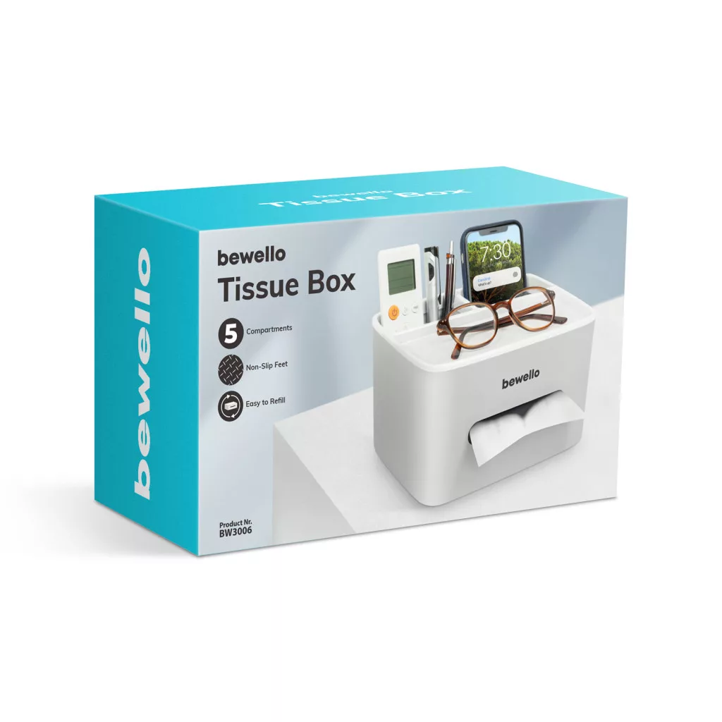 Tárolja papírzsebkendőit ebben az asztali tartóban. Az adagoló oldalán található nyíláson keresztül könnyen hozzáférhető a bele helyezett kendő, mégis rejtve marad a szem elől. A tartó tetején található nyílások alkalmassá teszik írószerek, irodai eszközök, mobiltelefon tárolására is. Ideális választás lehet hálószobába, fürdőszobába, irodába történő alkalmazásra.