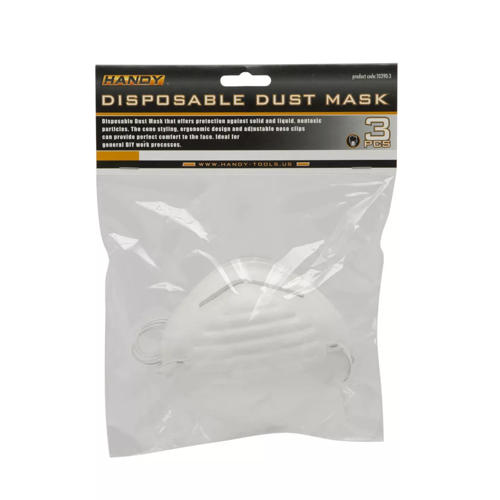 Egyszer használatos por elleni védőmaszk nem mérgező durva porok és nem toxikus szilárd részecskék ellen. Kónusz forma, orrcsipesz, kényelmes felfekvés. Általános DIY használatra tervezve.
