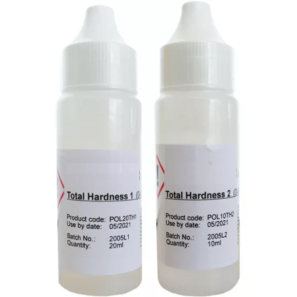 A teljes vízkeménység ellenőrző teszt folyadék. Egyes paramétereket folyékony reagensekkel lehet, vagy kell mérni. Folyékony reagenseknél nincs szükség a tabletta összetörésére