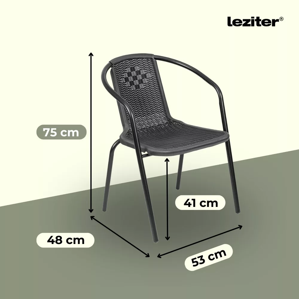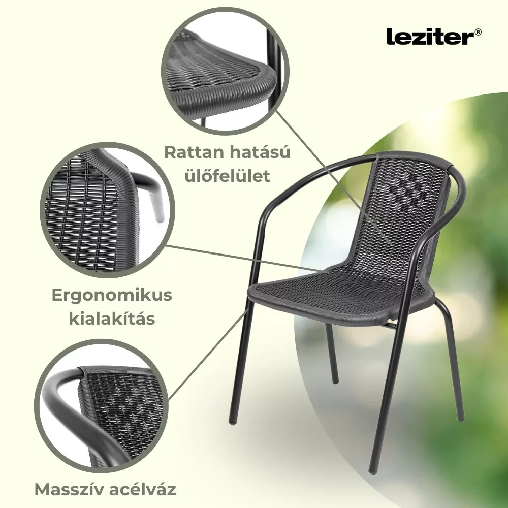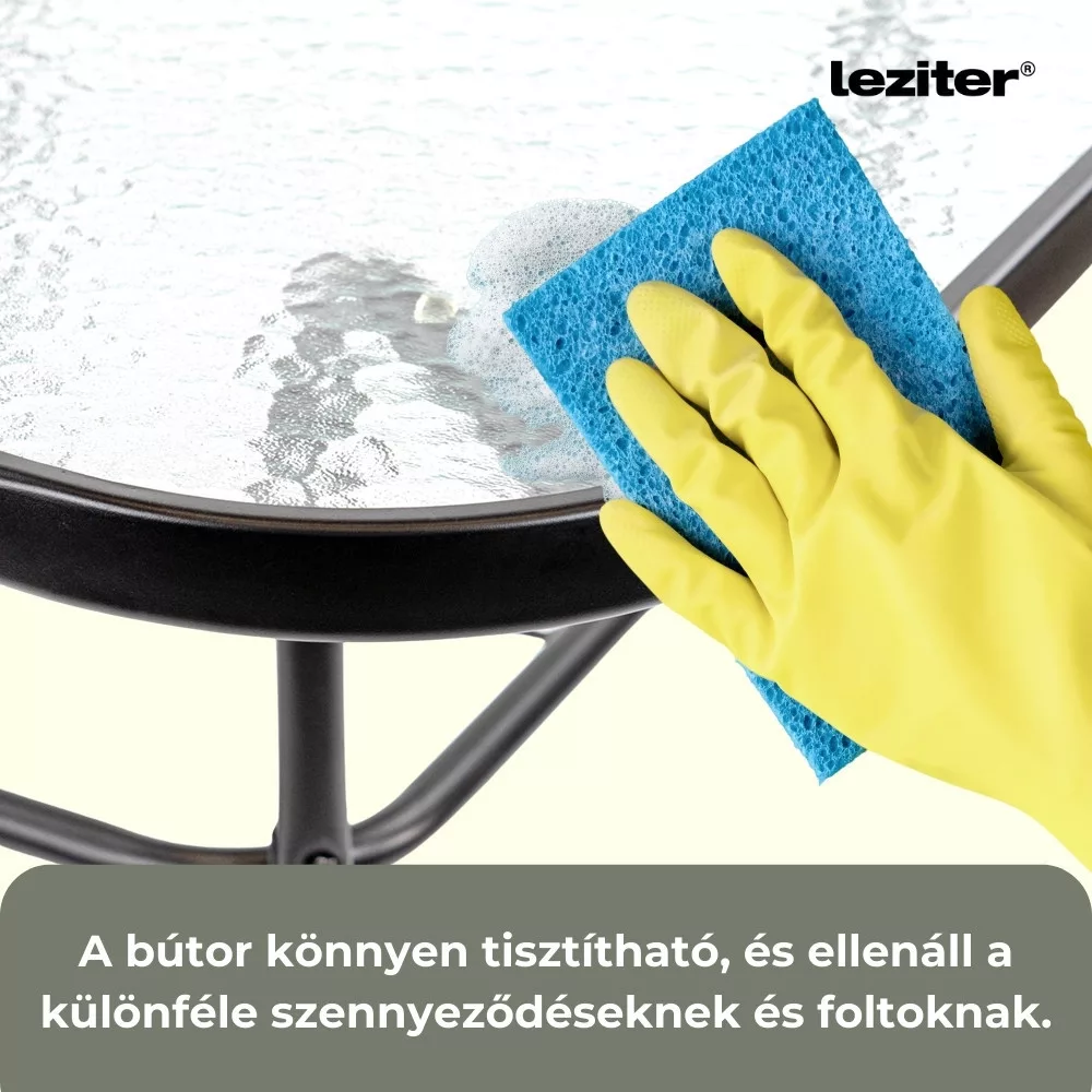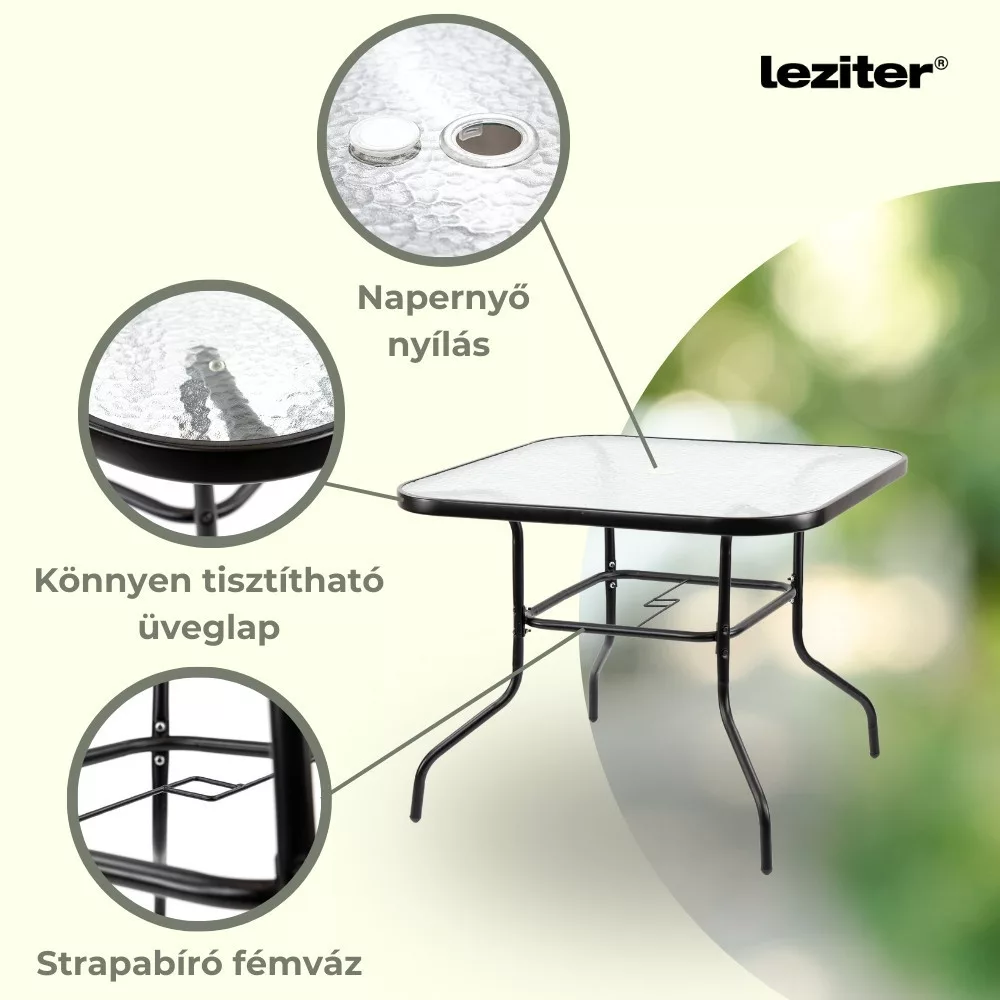 A modern kivitelű kerti bútorkészlet egy kerti üveglapos asztalt és 4 széket tartalmaz. A bútorokat 4 fő számára tervezték. A székek és az asztal lábazata acélból készül. Az asztallap 5 mm-es edzett üvegből készült, amely ellenáll a kisebb karcolásoknak. A műanyag szék ülésanyaga ellenáll az időjárási viszonyoknak. Előnye az ergonómikusan profilált ülés és karfa, amelyek tehermentesítik a vállakat pihenés közben.