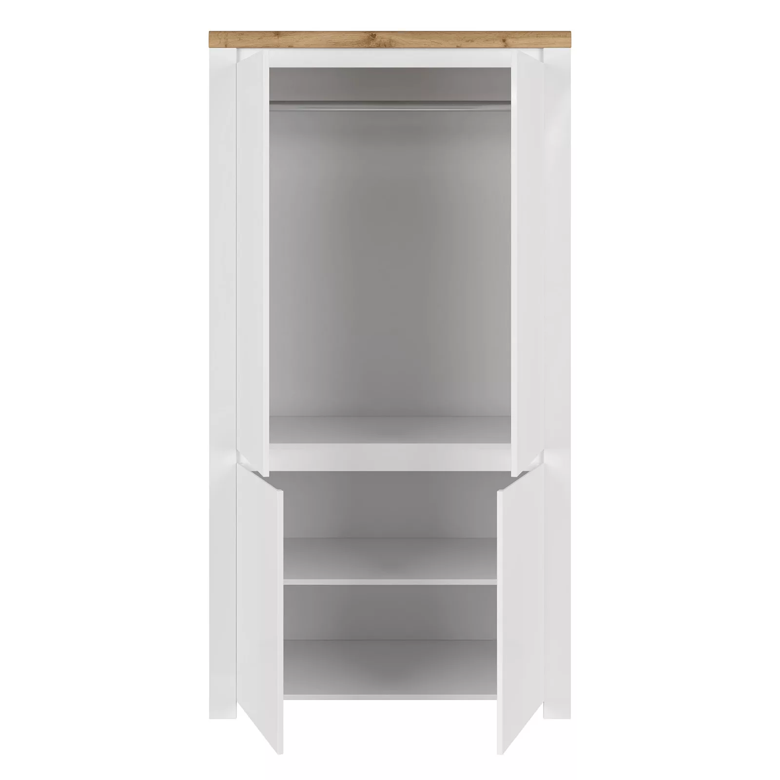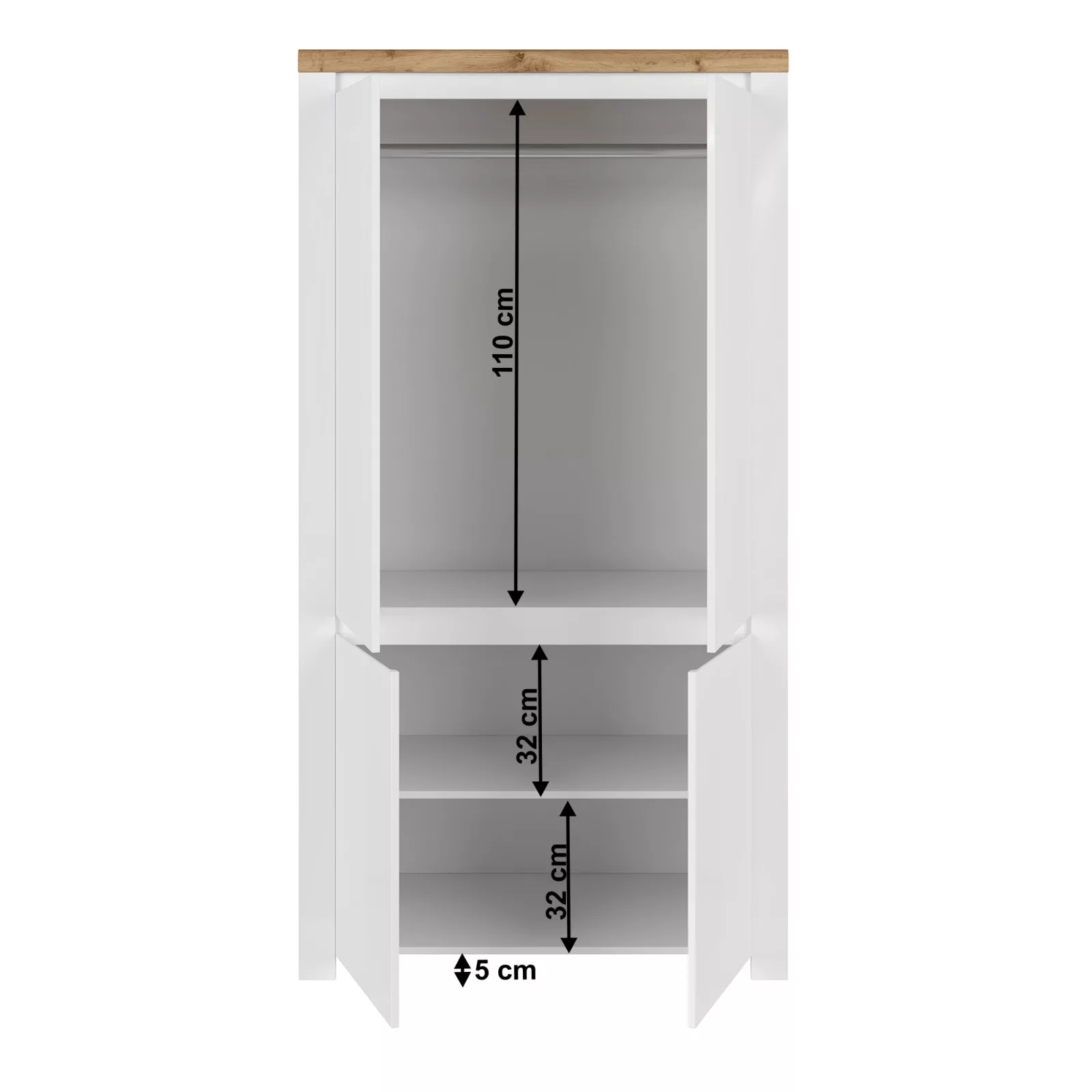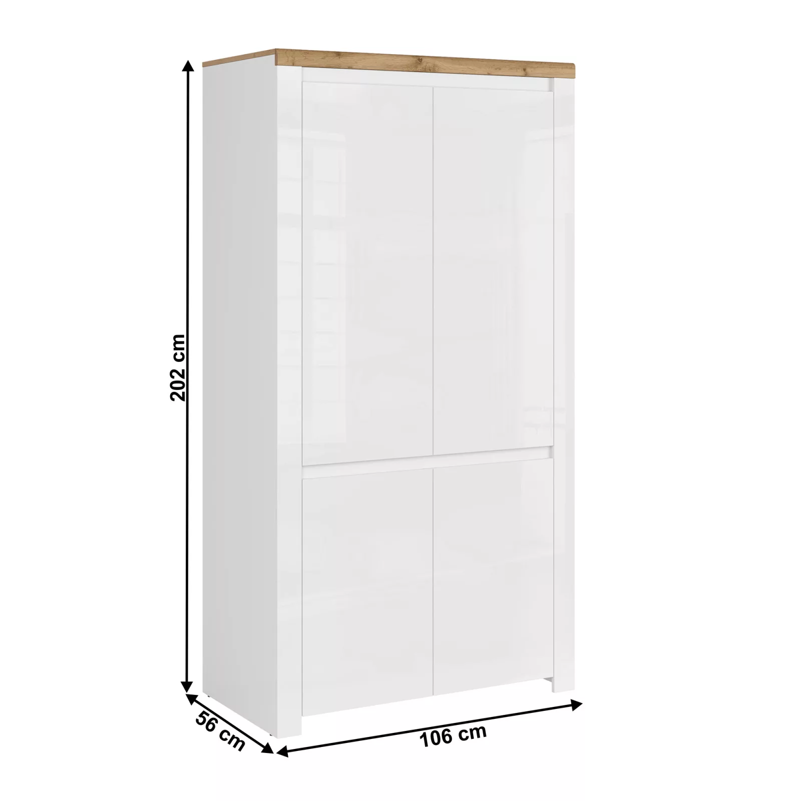 Anyag: laminált DTD/ABS élek/MDF Szín: fehér extra magasfényű/wotan tölgy Méretek(SzxMéxMa): 106x56x202 cm Anyag vastagsága: 1,6 - 2,2 cm Az alsó tér magassága a padlótól: 5 cm 4 ajtós 3 polc, 1 akasztórúd A szekrényekben polcok vannak Felső polc magassága: 110 cm Alsó polcok magassága: 32 cm Sok tárhely Fogantyúk nélkül MDF ajtók Bontásban szállítva