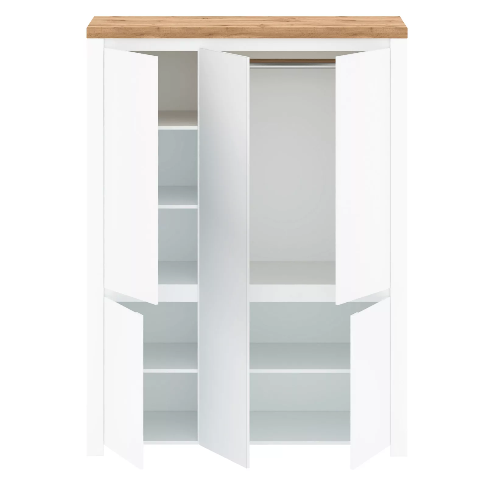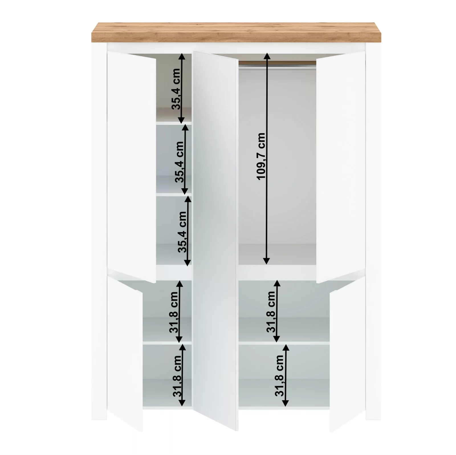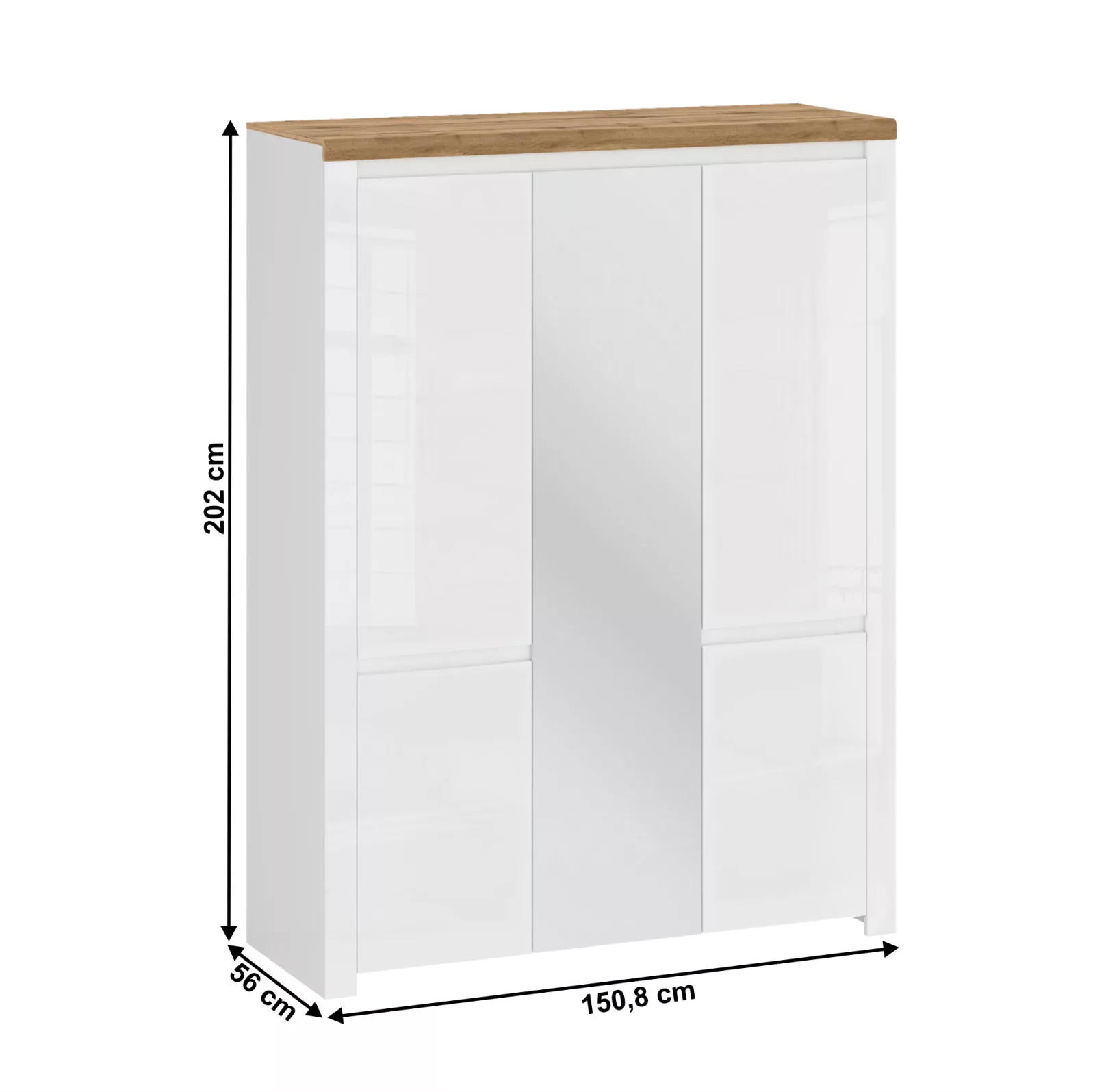 Anyag: laminált DTD/ABS élek/MDF Szín: fehér extra magasfényű/wotan tölgy Méretek(SzxMéxMa): 150,8x56x202 cm Anyag vastagsága: 1,6 - 2,2 cm Az alsó tér magassága a padlótól: 5 cm 5 ajtós 4 polc, 1 akasztórúd, 1 tükör A szekrényekben polcok vannak A felső kisebb polcok magassága: 35,4 cm A felső nagy polc magassága: 109,7 cm Alsó polcok magassága: 31,8 cm Sok tárhely Fogantyúk nélkül MDF ajtók Nyitás/zárás a kivágással Bontásban szállítva