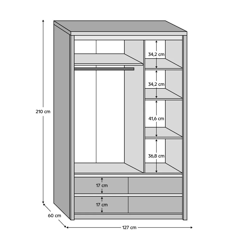 Méretek (SzéxMéxMa): 127x60x210 cm