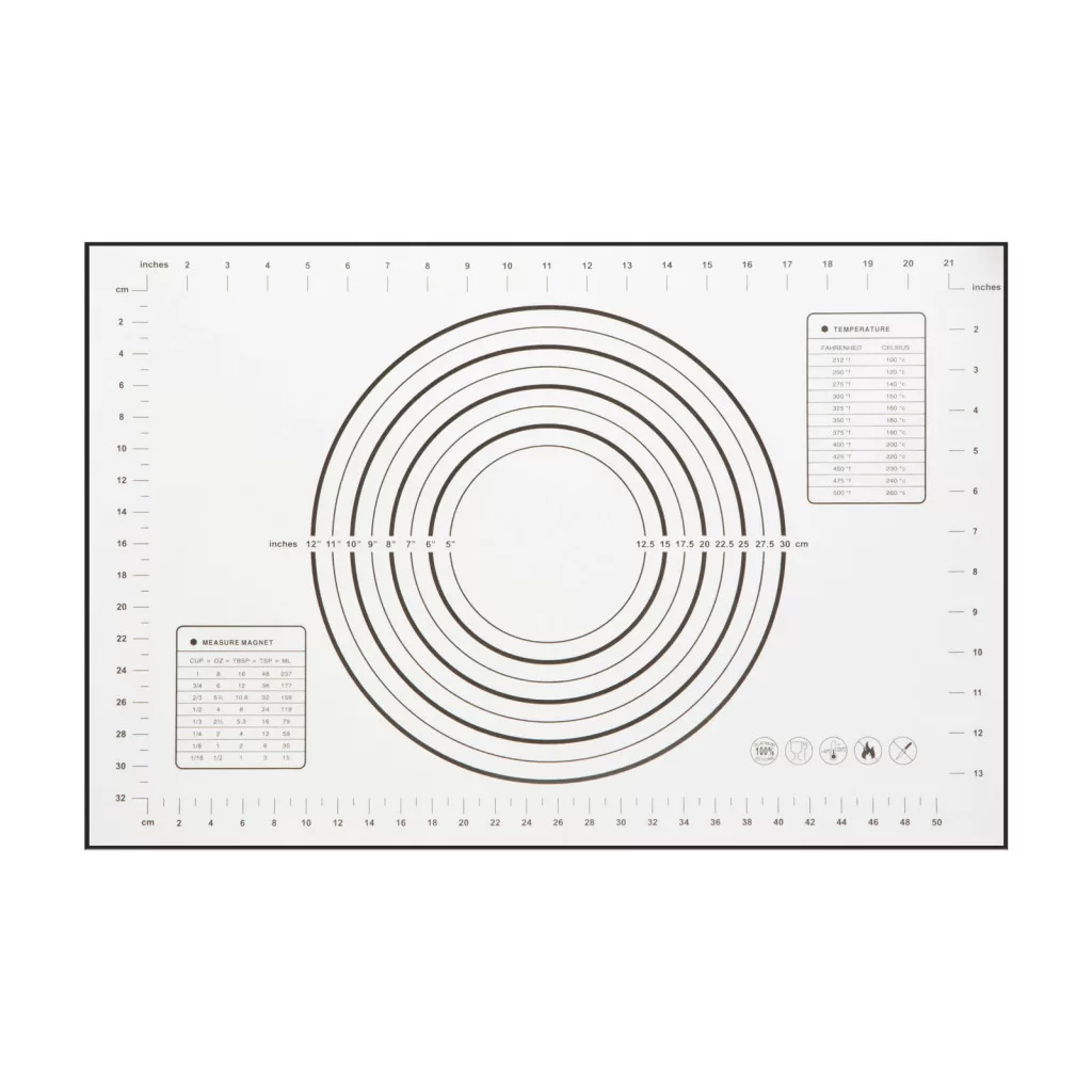 Méretpontos nyújtást segítő skálázott szilikon lap, amely használatával gyorsan készíthet bármilyen tésztából kör, négyzet, téglalap alakú süteményt.