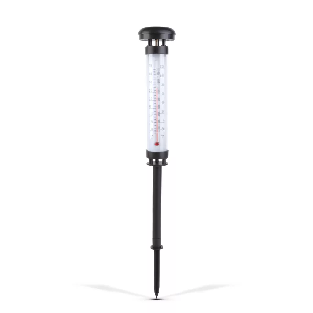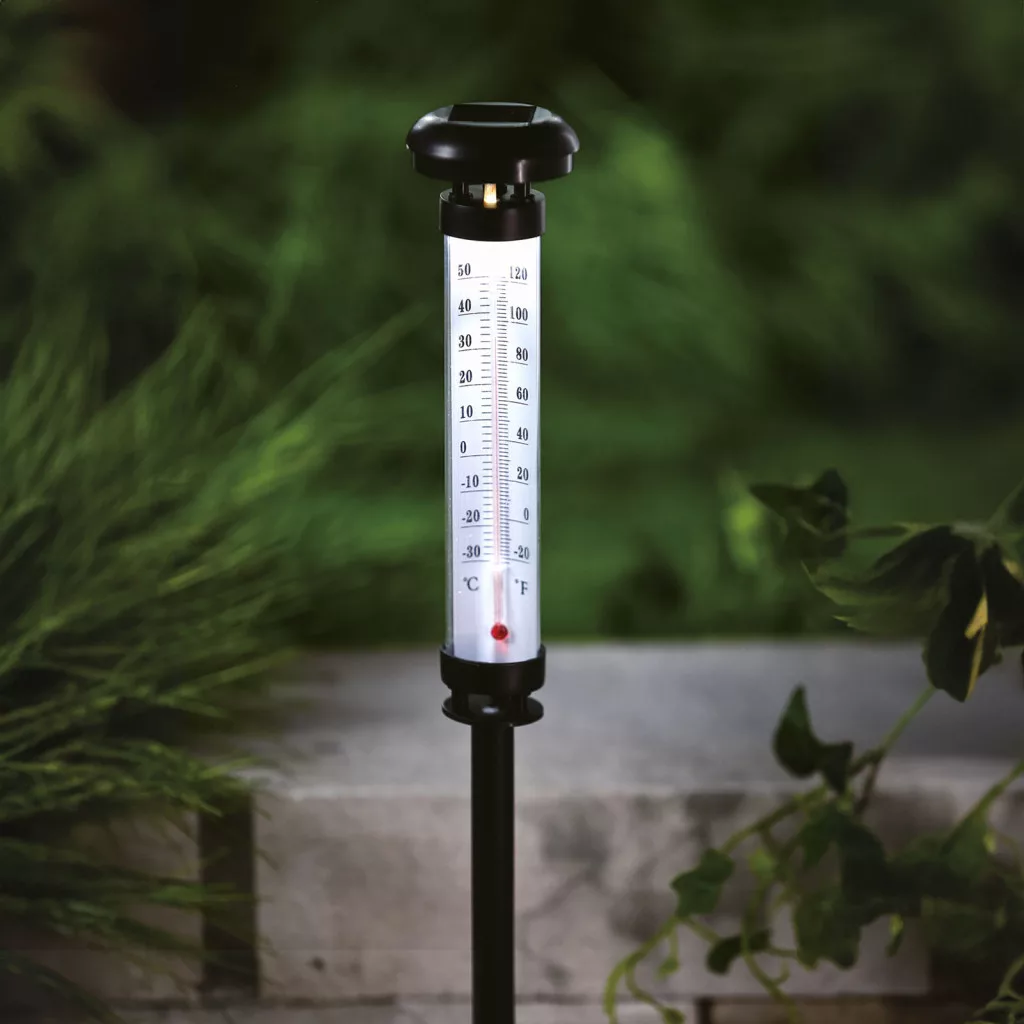 Tegye kertjét még különlegesebbé ezzel a praktikus, szolár világítással ellátott kerti hőmérővel! Ez a könnyen leszúrható hőmérő bármely kertben, udvarban vagy virágágyásban elhelyezhető, így mindig szemmel tarthatja a hőmérsékletet. A hidegfehér LED világításnak köszönhetően sötétedés után is könnyedén leolvashatja az aktuális hőmérsékletet, miközben fényt ad a környezetének. Napelemes működése révén energiatakarékos, így nincs szükség elemcsere vagy külső tápellátásra.