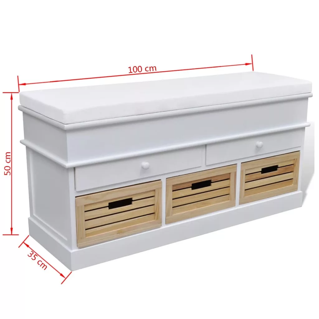 2 fiókkal és 3 alsó tároló ládával rendelkezik. Ugyanakkor a pad ülőke praktikus megoldás az egyszerű, rendezett és tiszta tárolásra. Cipők, táskák, könyvek, játékok és egyéb értékek tárolására ideális.