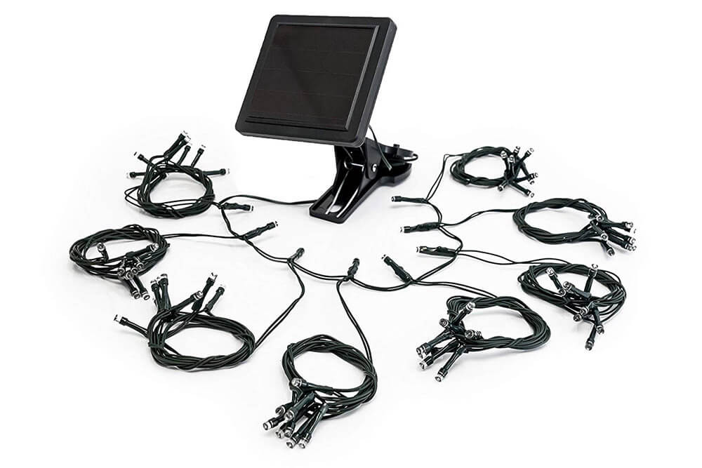 A 8 felé ágazó fényfüzért a napernyő merevitőire kell feltekerni, a napelemet pedig a földbe szúrva, vagy az ernyőre csíptetve tudjuk rögzíteni.