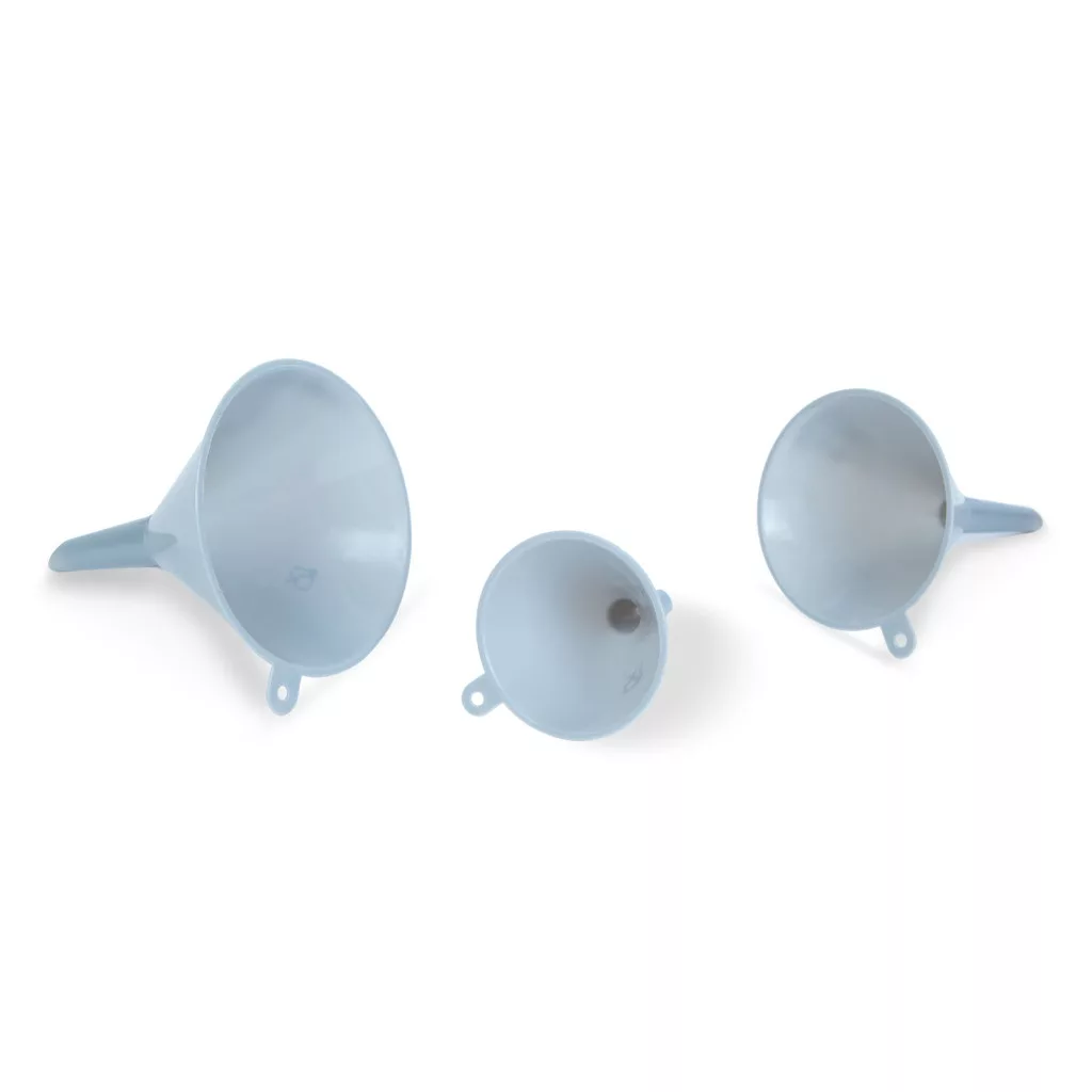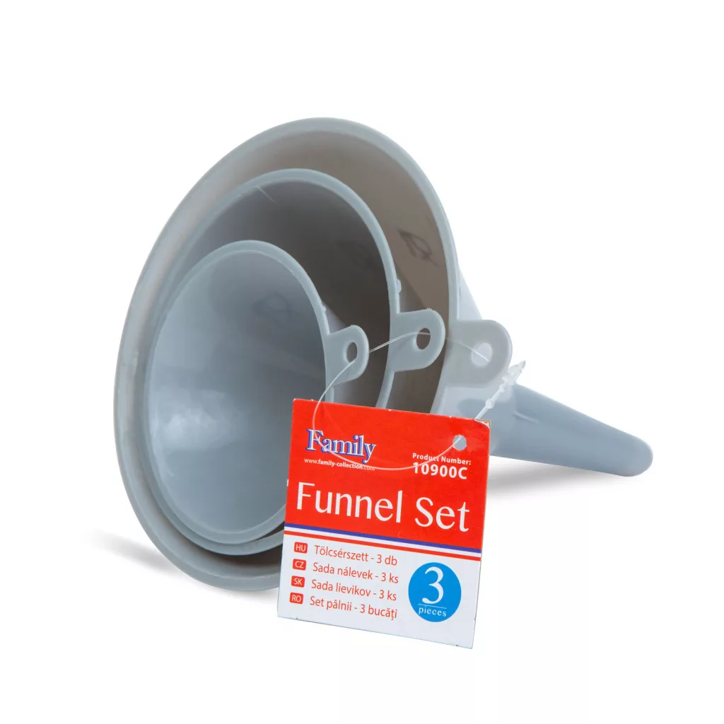 Többféle méretű tölcsérből álló szett, amely hasznos lehet minden háztartásban. Ideális lehet folyadékok üvegbe töltésekor.
