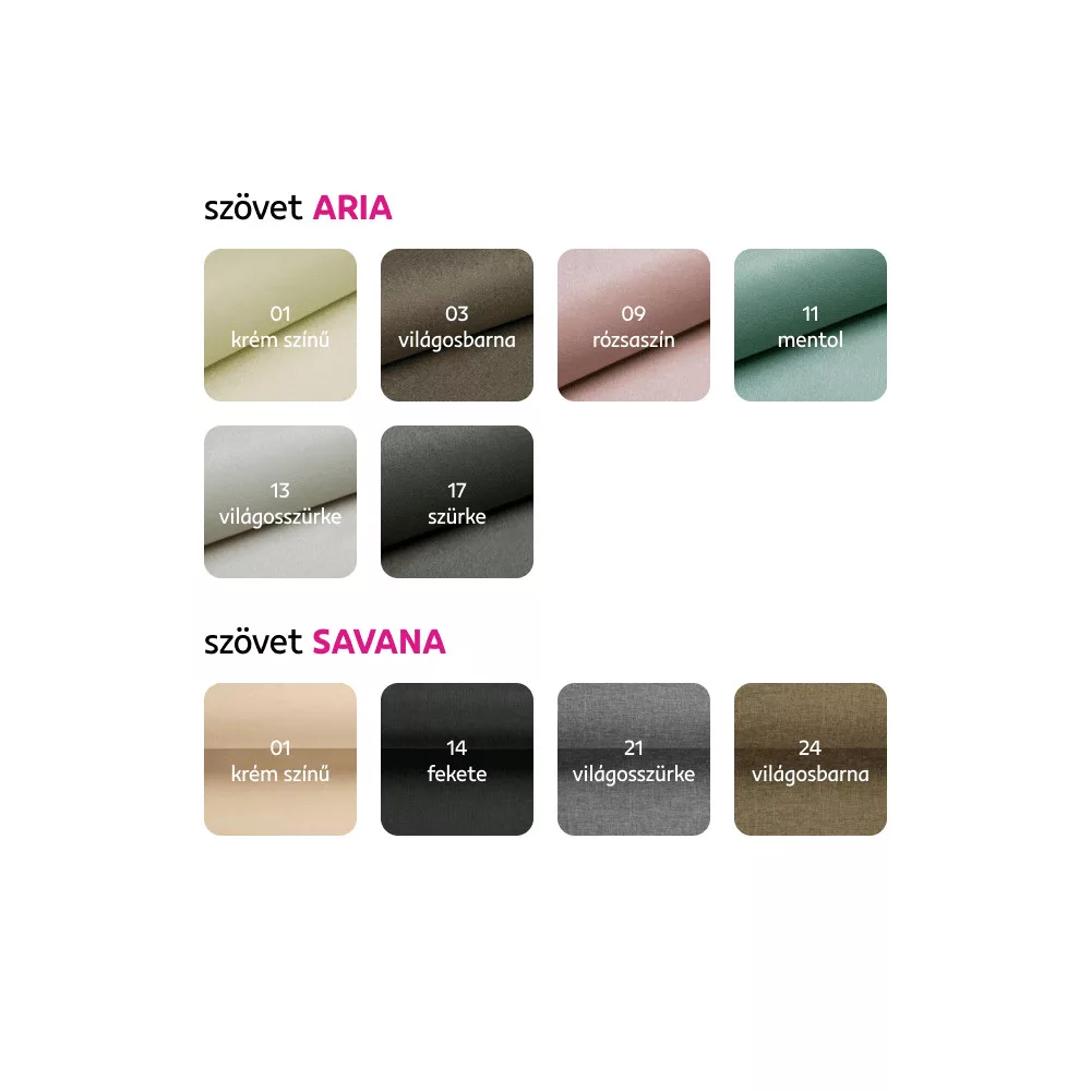 Az ülőgarnitúra más színben is rendelhető. Lehetősége van választani az Aria szövet hat árnyalatából és a Savana szövet négy színéből. Választhat a Savana vagy Aria szövet hat színváltozatából. Választását jelölje meg közvetlenül a megrendelőlapon. Ar: 731 900 Ft. Szállítási idő 6-8 hét.