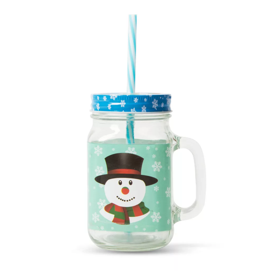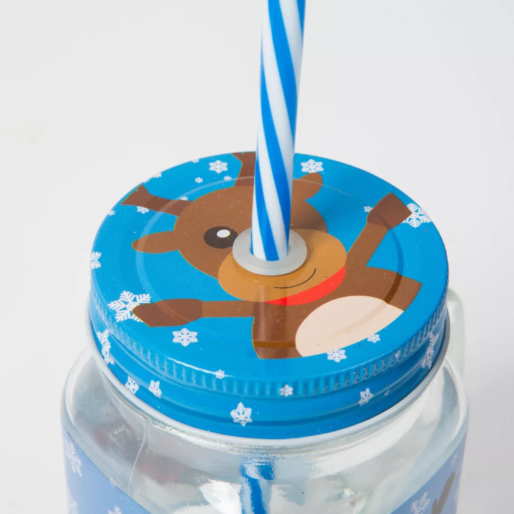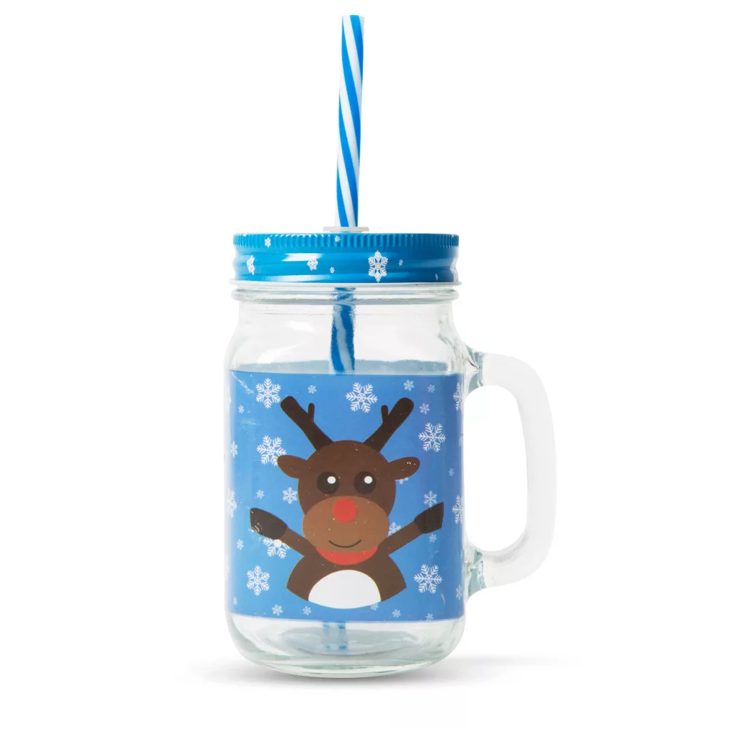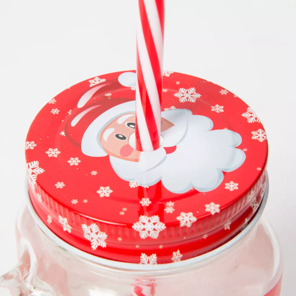 Üveg korsók, vidám karácsonyi mintákkal: Mikulás, hóember, rénszarvas, különböző színekben, fém zárókupakkal.