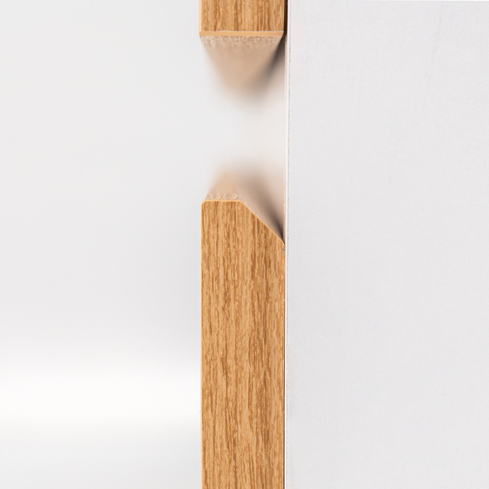 Az fehér korpusz és a tölgy front kombinációja elegáns és időtálló megjelenést kölcsönöz a bútornak.