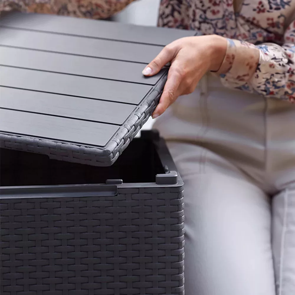 Az asztal teteje könnyedén felnyitható, így kiegészítő tárolóhelyet biztosít a kerti eszközöknek, párna- és takarótárolásra is ideális. A tető stabil felületet nyújt, amit asztalként is használhatsz, legyen szó italokról vagy kerti dekorációról.