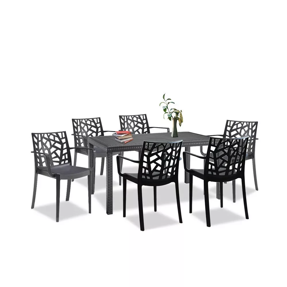 Olaszországban készült ez a grafit színű, kényelmes és elegáns bútor szett. hat 55x 58x 82cm-es széket és egy 150x 90x 74 cm-es négyszögletes magas asztalt foglal magába.