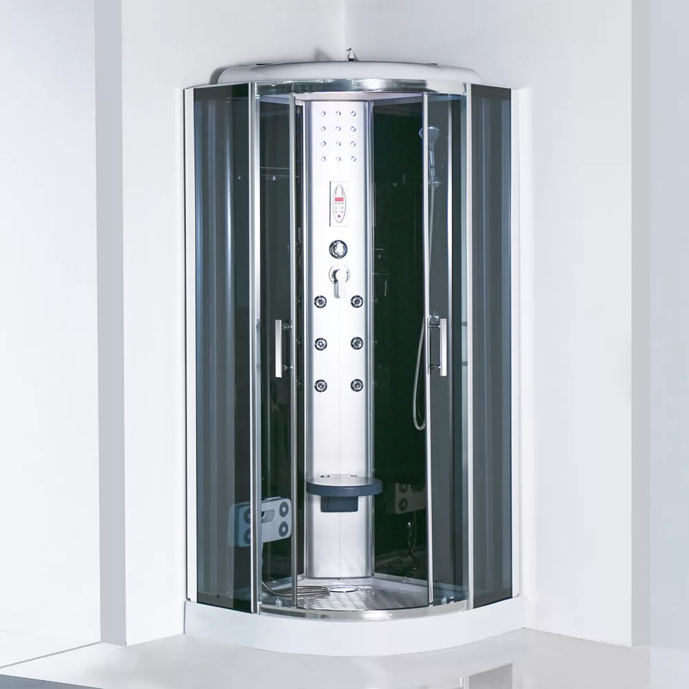 A zuhanykabin 6 hátmasszírozó fúvókával van felszerelve. Az alumínium hátsó panel és a beépített elektronika, kezelőpanel, rádió és hangszórók lehetővé teszik, hogy minden zuhanyzás egy igazi élménnyé váljon. A hátsó és felső hangulatvilágítás, valamint a felső világítás tovább fokozza a relaxációt, miközben a praktikus piperepolc és a lábmasszírozó gondoskodik a maximális kényelemről.