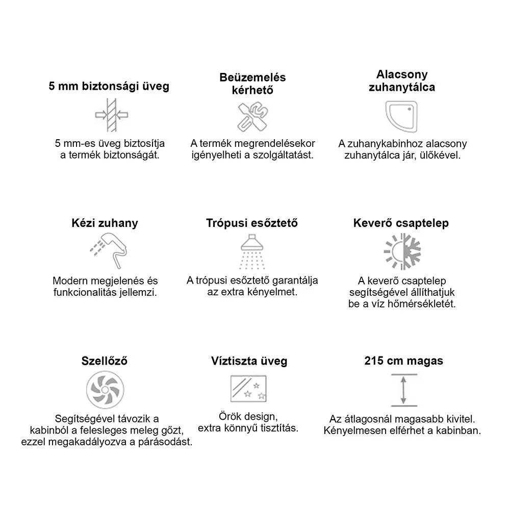 | Profil | erősített matt króm | Zuhanykabin méret | 80x80x205cm |