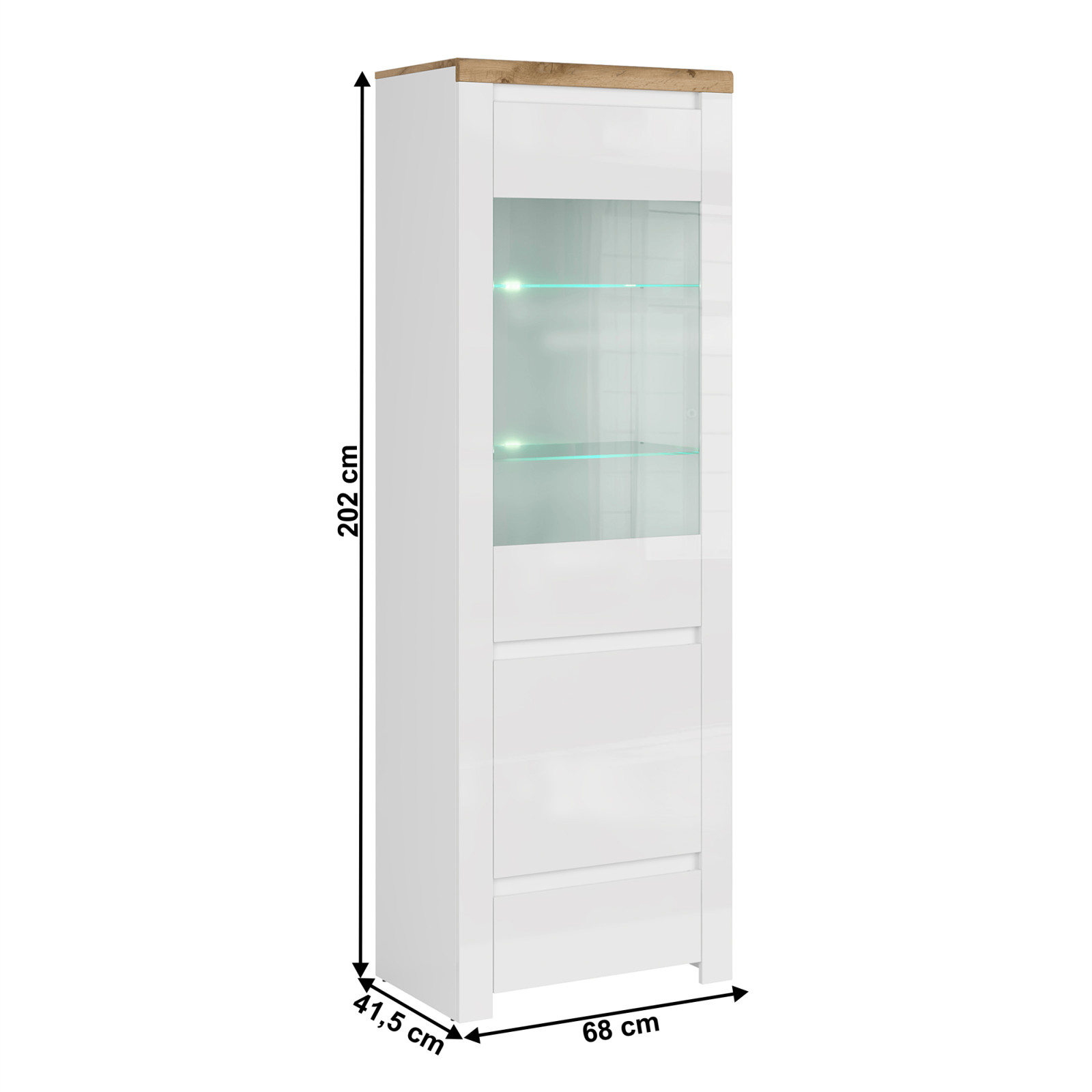 Anyag: laminált DTD/ABS élek Szín: fehér extra magasfényű/wotan tölgy Méretek(SzxMéxMa): 68x41,5x202 cm Ajtók anyaga: MDF/üveg Az alsó tér magassága a padlótól: 5 cm Anyag vastagsága: 1,6 - 2,2 cm Kombinált vitrin Üvegajtókat és két üvegpolcot tartalmaz Két szekrény a egy fiók Fiók magassága: 20,2 cm A szekrényben polcok vannak Felső polcok magassága: 36 cm Alsó polcok magassága: 19,8 cm Fogantyúk nélkül LED világítás nélkül LED világítás megvásárolható Nyitás/zárás a kivágással Bontásban szállítva