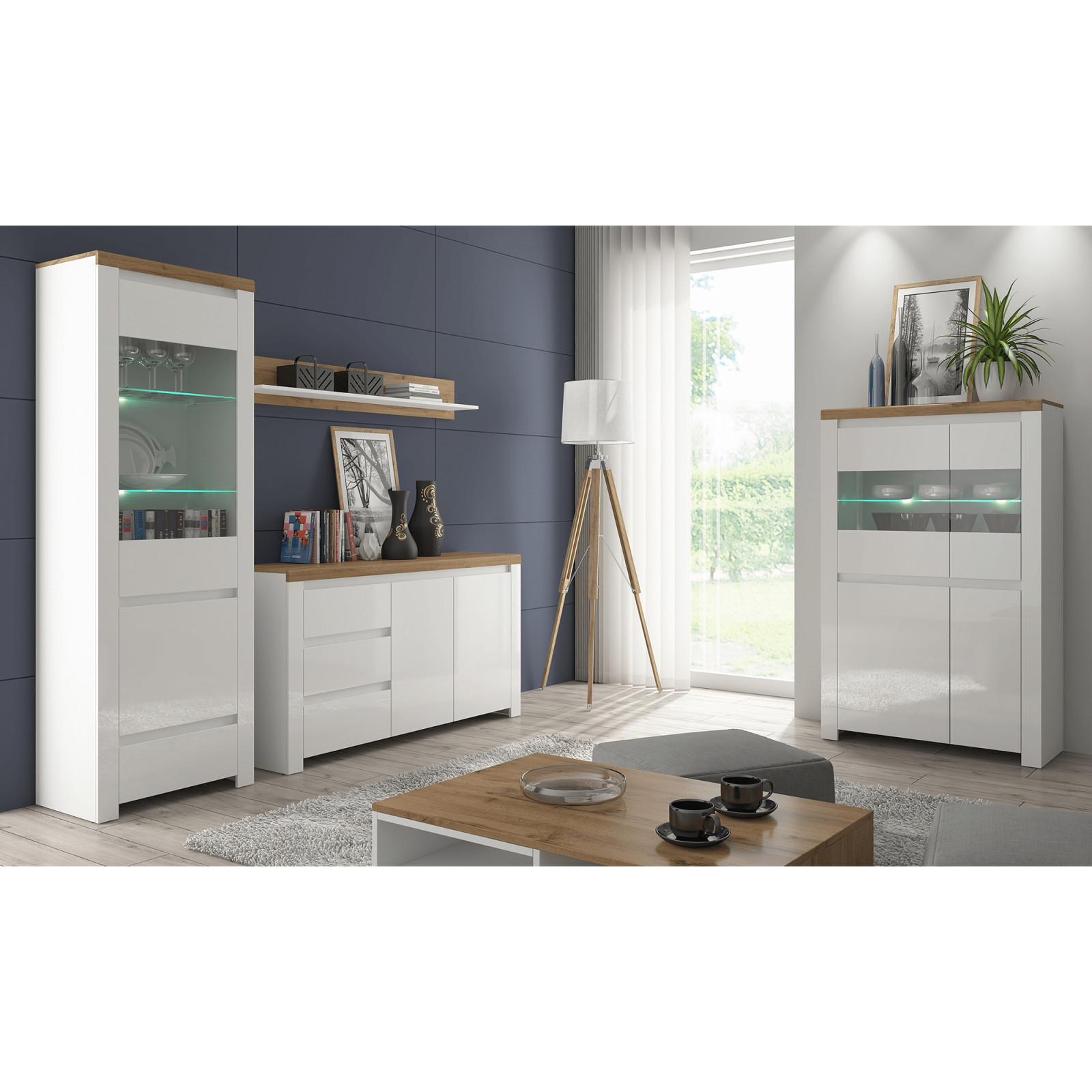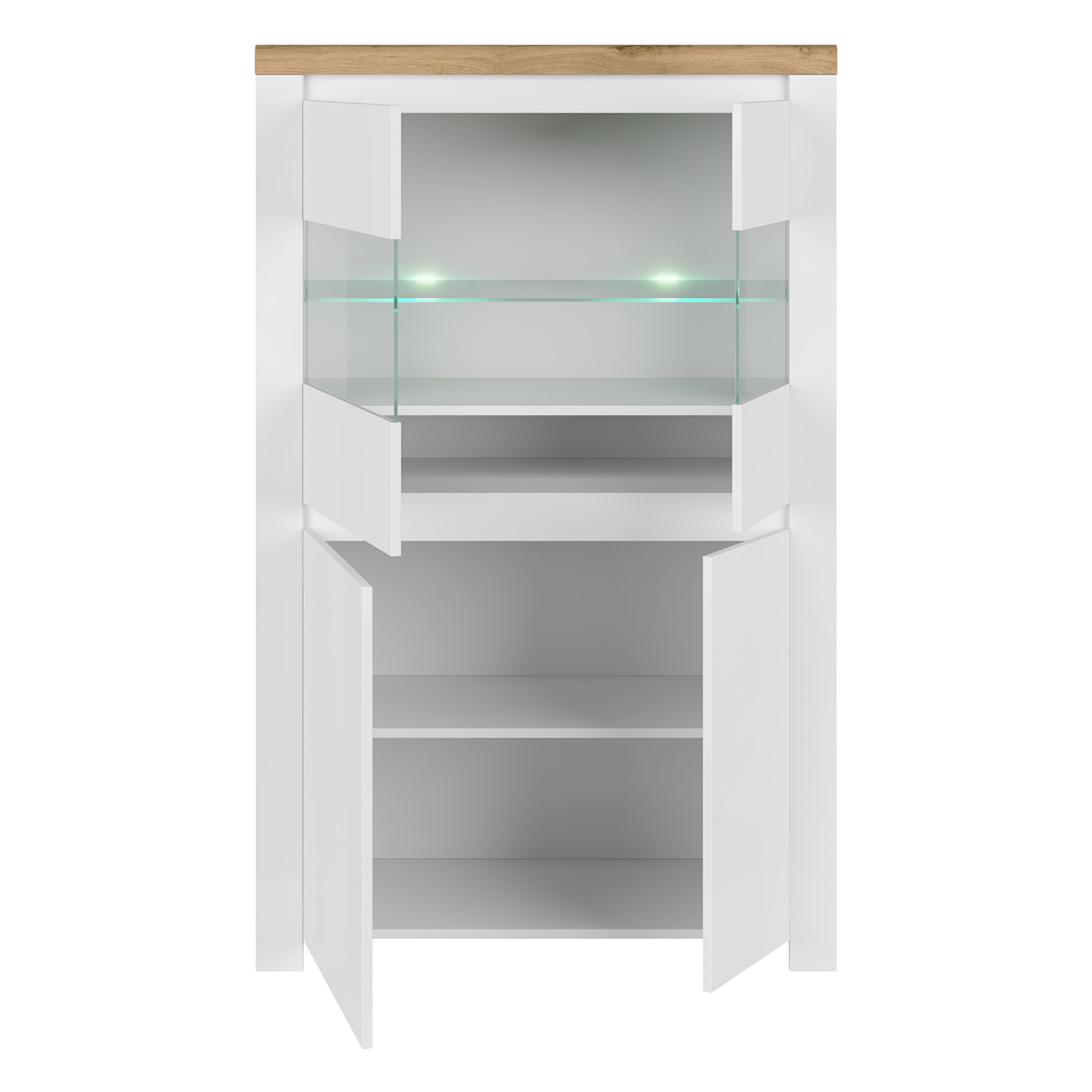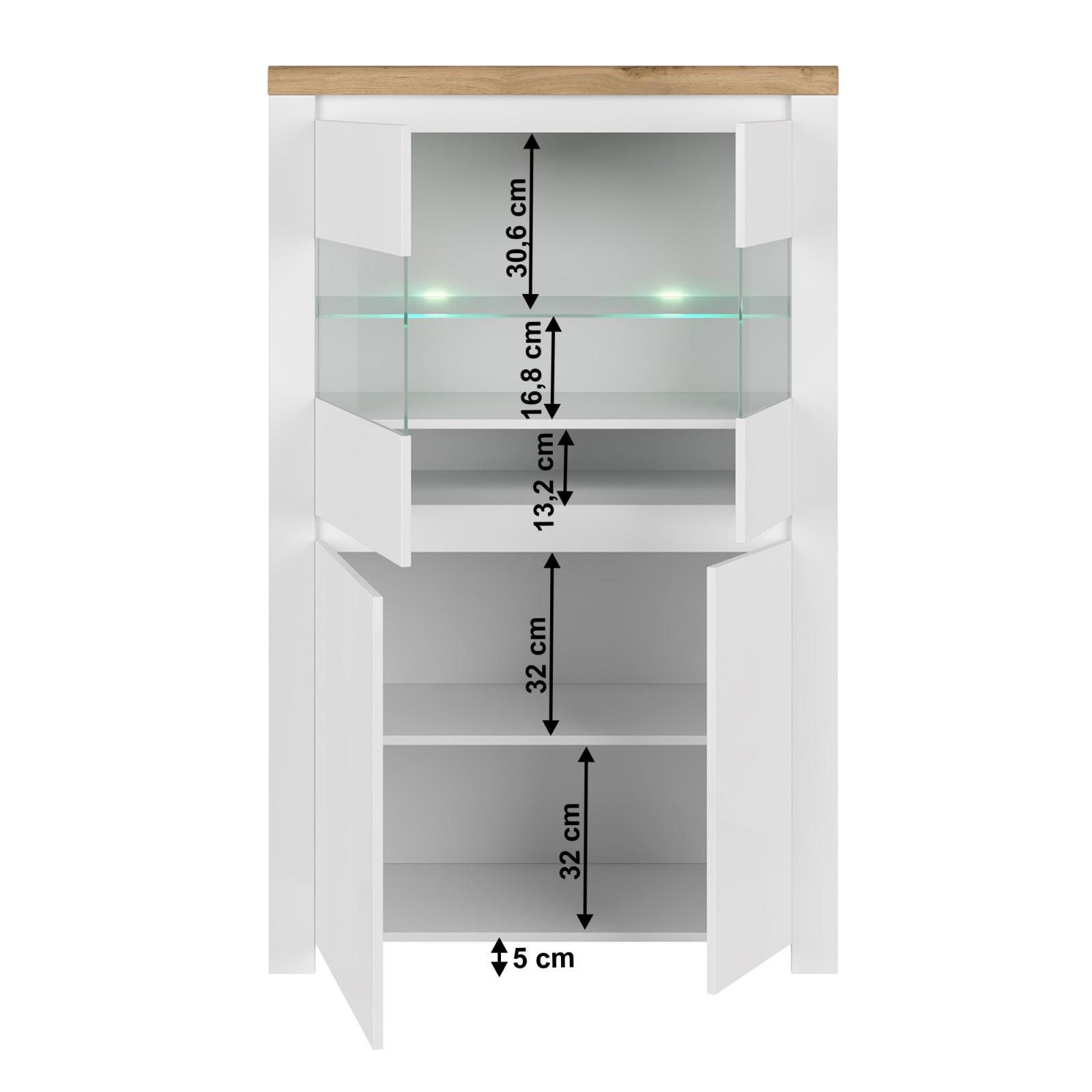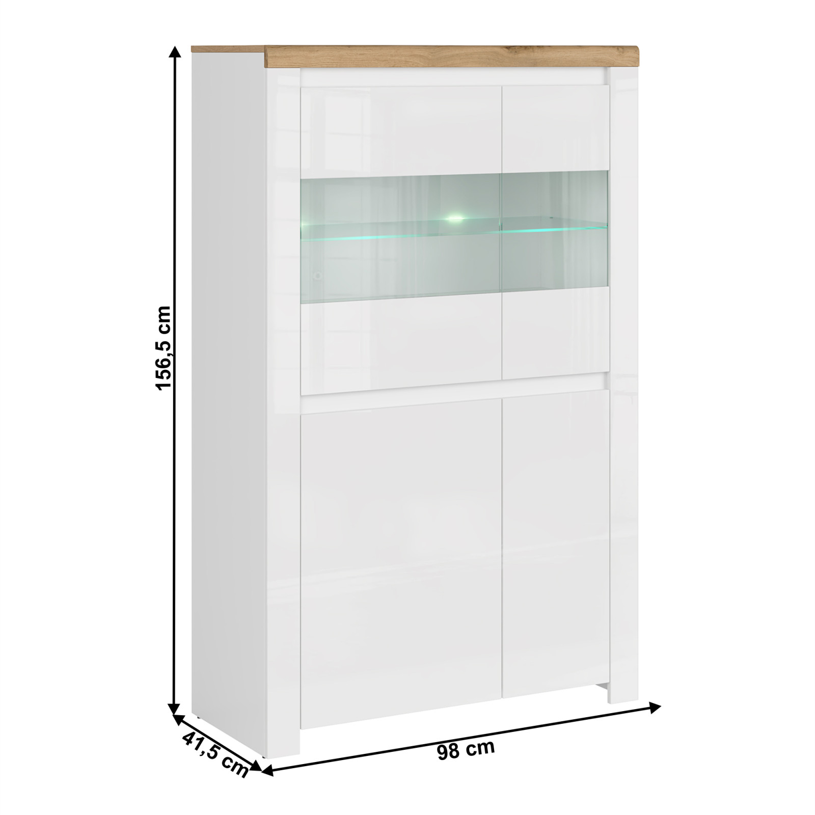 Anyag: laminált DTD/ABS élek Szín: fehér extra magasfényű/wotan tölgy Méretek(SzxMéxMa): 98x41,5x156,5 cm Ajtók anyaga: MDF/üveg Az alsó tér magassága a padlótól: 5cm Anyag vastagsága: 1,6 - 2,2 cm Négyajtós Üvegajtókat és üvegpolcot tartalmaz Két szekrény A szekrényben polcok vannak Alsó polcok magassága: 32 cm Az első felső polc magassága: 30,6 cm A második felső polc magassága: 16,8 cm A harmadik felső polc magassága: 13,2 cm Fogantyúk nélkül LED világítás nélkül LED világítás megvásárolható