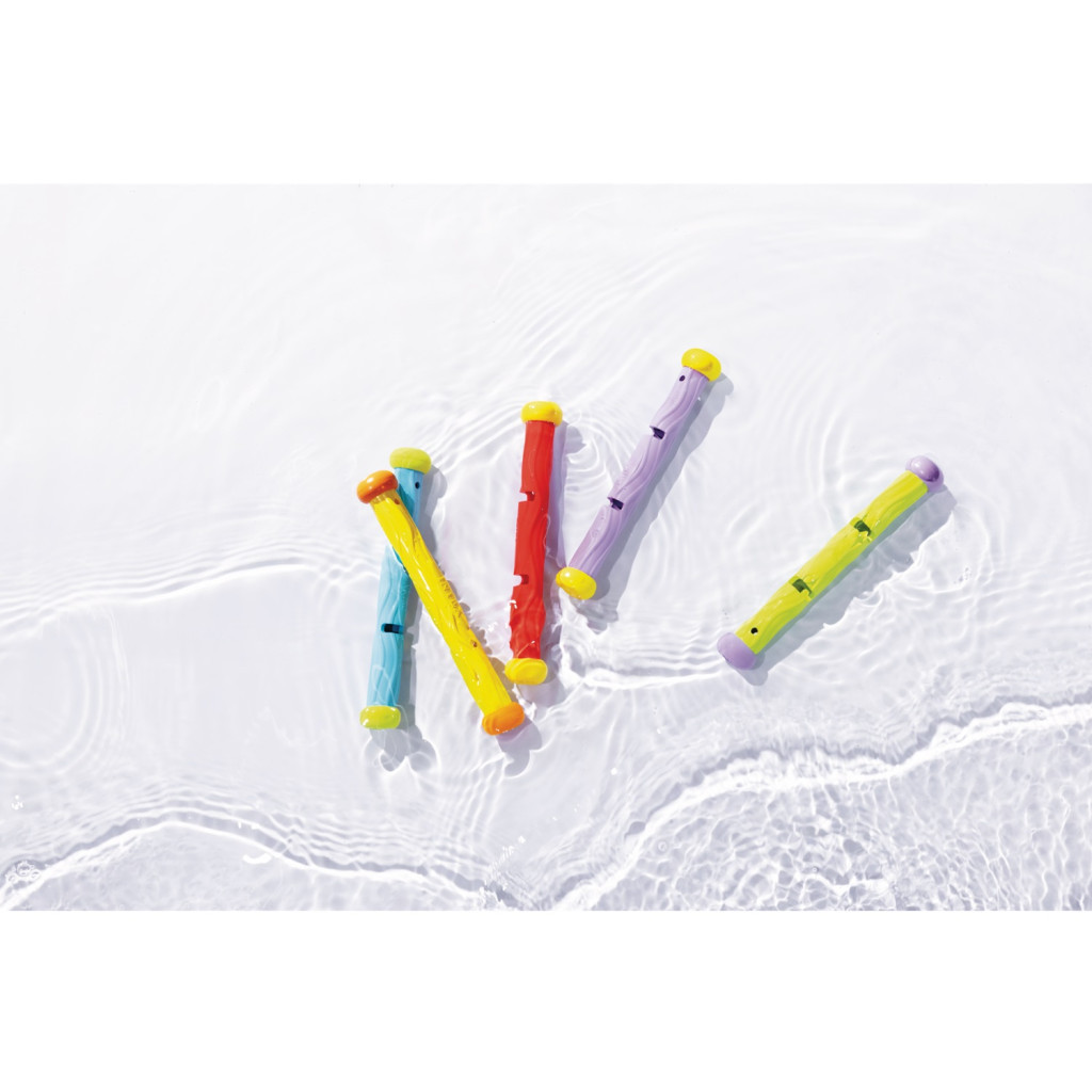Tedd még izgalmasabbá a búvárkodást ezekkel a víz alatti játékpálcikákkal, amelyek vidám színeikkel és különleges viselkedésükkel azonnal lekötik a gyerekeket. A pálcikák a vízbe dobva lesüllyednek a medence aljára, ahol függőleges helyzetben megállnak, így könnyen észrevehetők és felvehetők. Puha, rugalmas anyaguk biztonságos játékot tesz lehetővé 6 éves kortól.