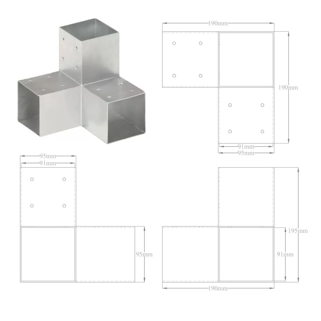 A horganyzott tartó összeköti és stabilan tartja a gerendákat. Az összes csatlakoztató gyári lyukakkal lett ellátva. Ez a gerendatartó 3 négyzet alakú, 91 mm-es fa gerenda számára való.