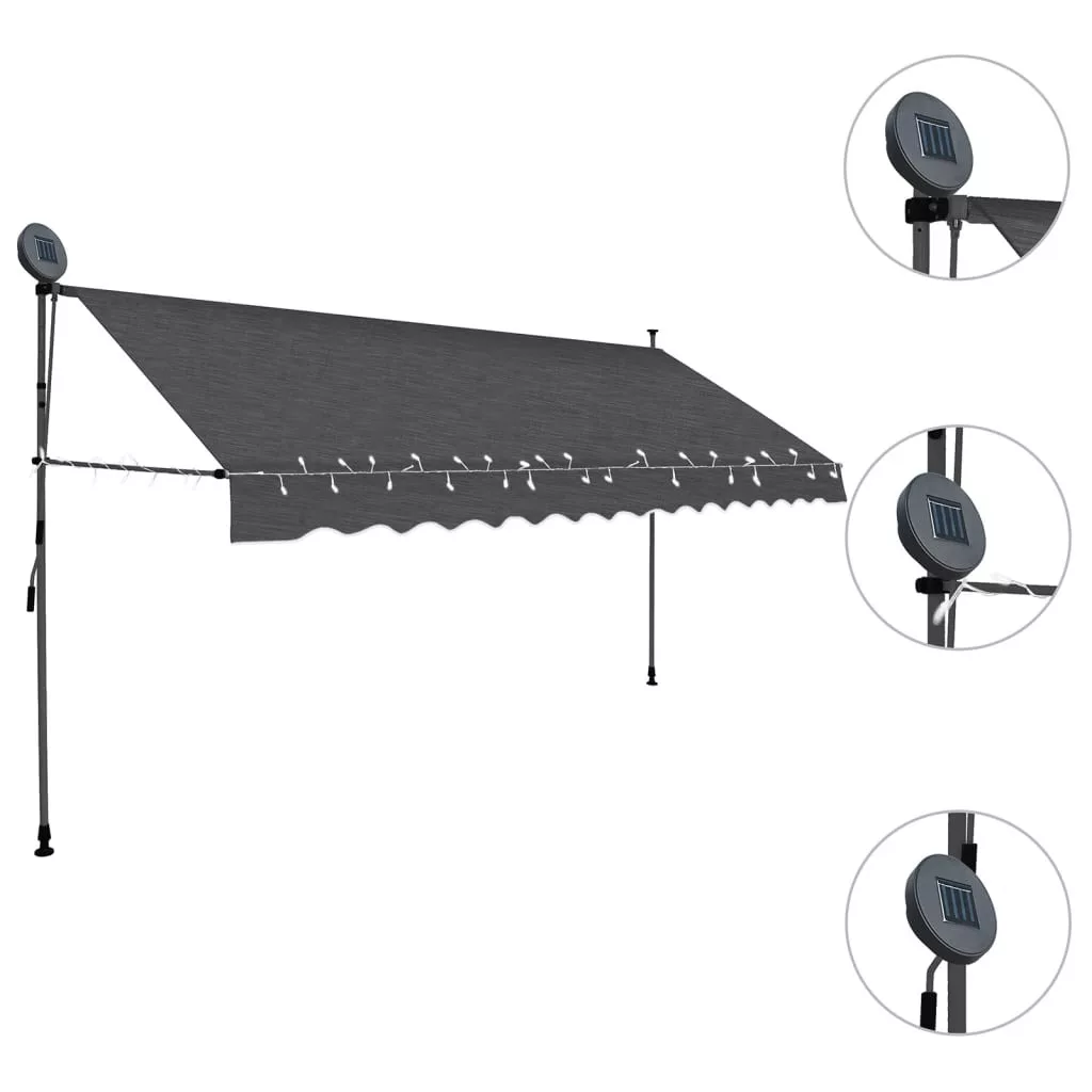 Ez a vízlepergető és kosztaszító, UV- és időjárásálló napellenző kiváló minőségű, poliuretánnal bevont poliészterből készült. Az erős acélváz stabillá és strapabíróvá teszi a szerkezetet. A könnyen tisztítható poliészterszövet levehető és mosható. A fogantyú segítségével a pergola feltekerhető. A szerelési magasság és szög igény szerint állítható. Ráadásul a napelemes LED-lámpák energiatakarékos éjszakai világításként szolgálnak. A napellenző könnyen összeszerelhető.