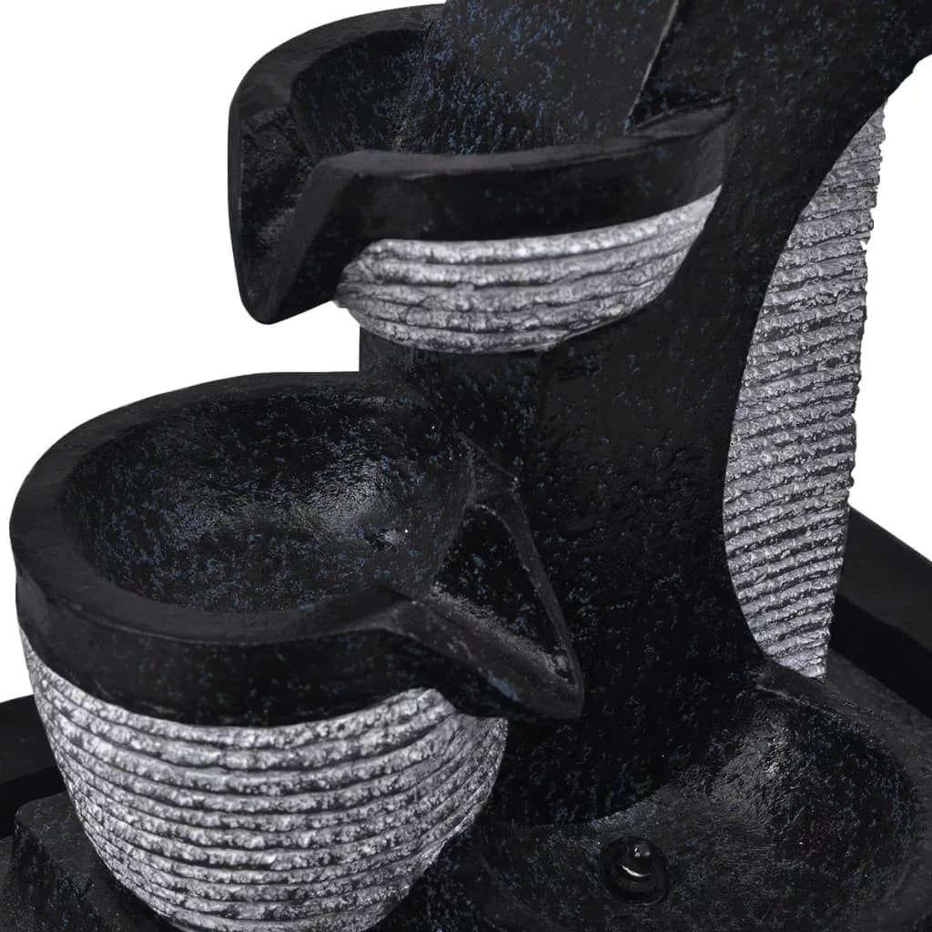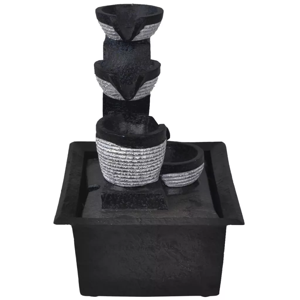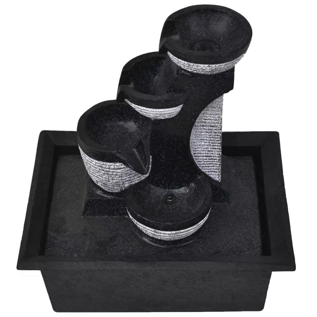 Ez a csobogós szökőkút bármely berendezés hozzáadása lehet. LED világítása, de főleg este, rendkívüli fényeffektusokkal látja el. Gyantázott poliészterből készült és UV álló, mely azt jelenti, hogy megőrzi jellegét és színét akkor is, mikor a napra tevődik ki. Több vízsugár csordogál lefele, mely lazító hangja egy nyugtató és meditatív környezetet hoz létre. A tartalmazott, kiváló minőségű pumpa biztosítja a megbízható működtetést.