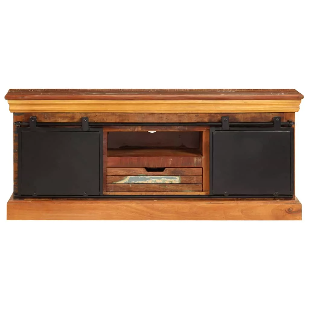 Ez a hifi-szekrény tömör újrahasznosított fából készült, amit a régi lebontott épületek gerendáiból, padlóiból és tartógerendáiból állítottak össze. Ezenkívül mintájában különféle fafajták jellemzői fedezhetőek fel, megtartva ezen fafajok, pl.: a fenyőfa, tíkfa, bükkfa, tölgyfa, mangófa vagy az akácfa sajátosságait. Az újrahasznosított fa már elöregedett, viharvert és száraz, emiatt nem zsugorodik vagy hajlik. Ez a komód teljes egészében kézzel készült és a fa gyönyörű erezete minden egyes bútordarabot egyedi megjelenéssel ruház fel. A fémajtóknak köszönhetően a szekrény ipari stílusú.